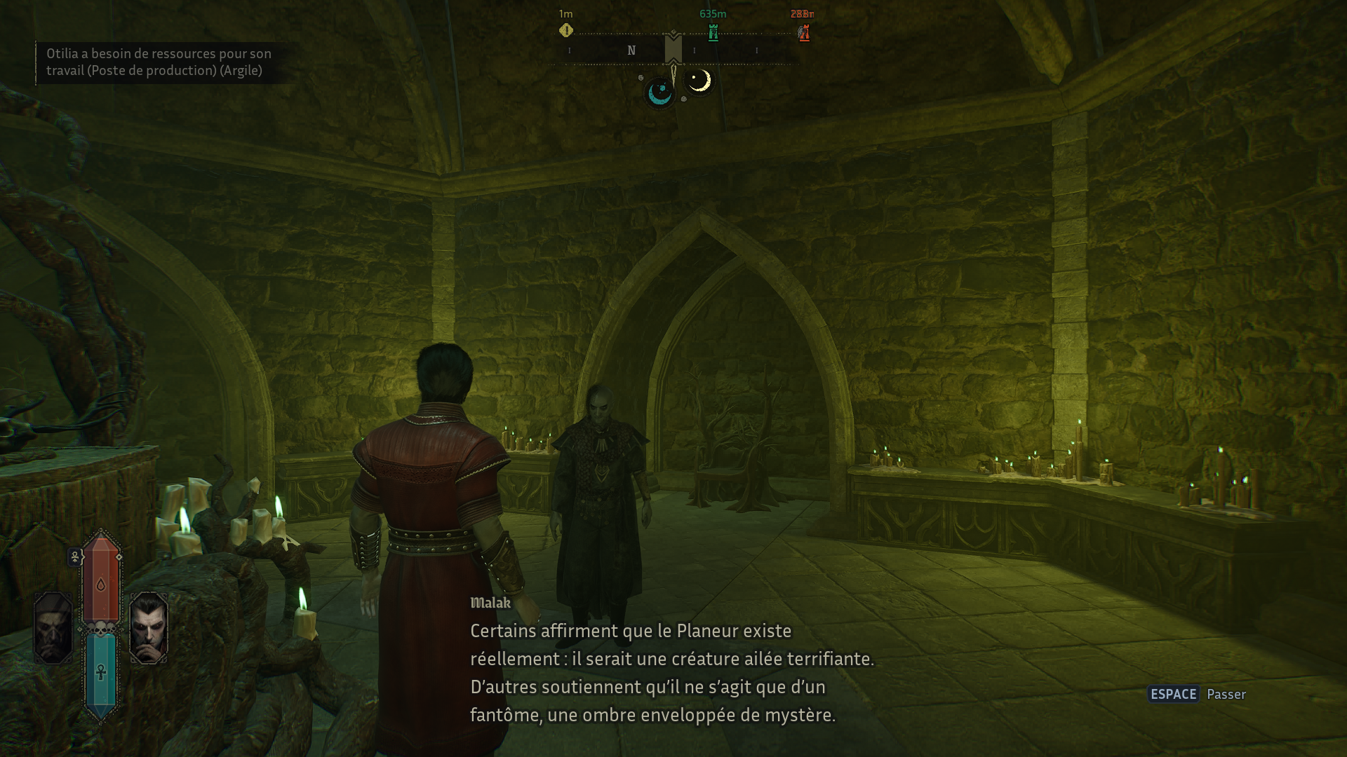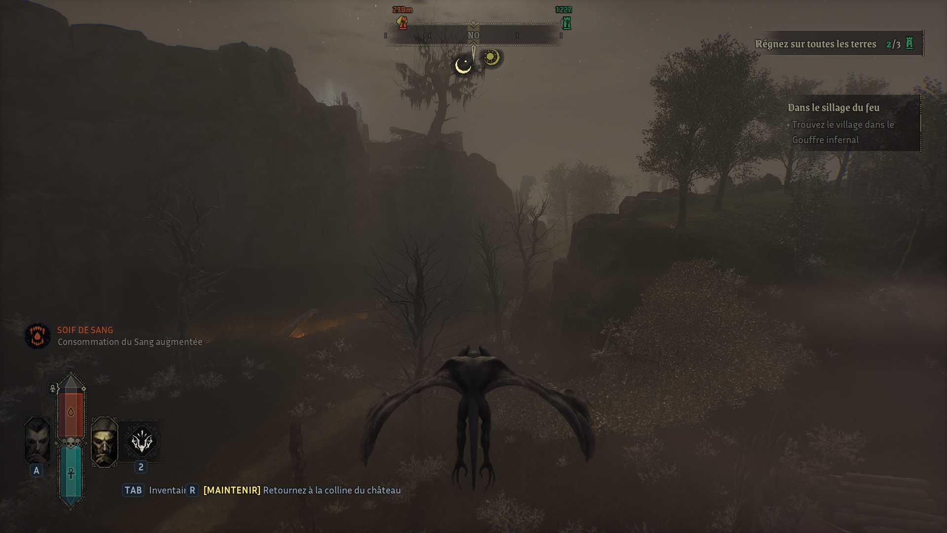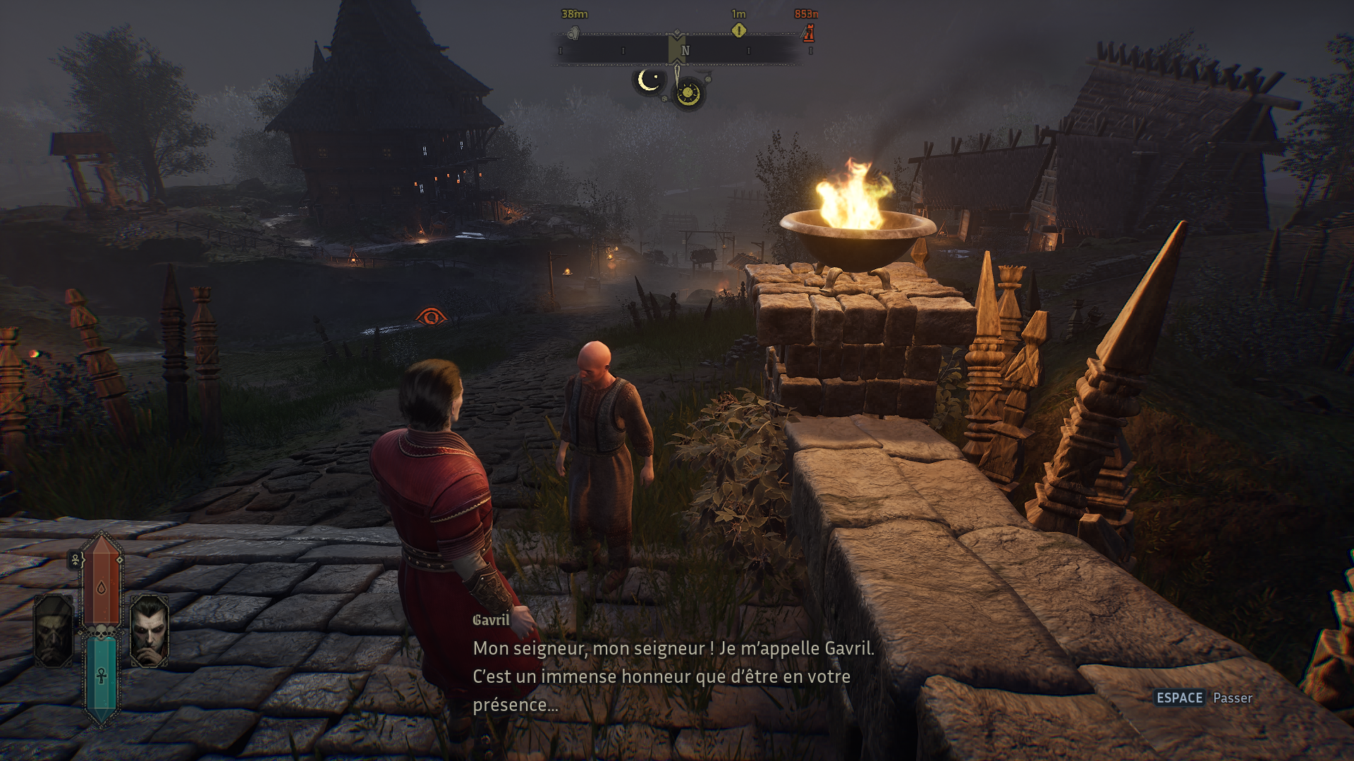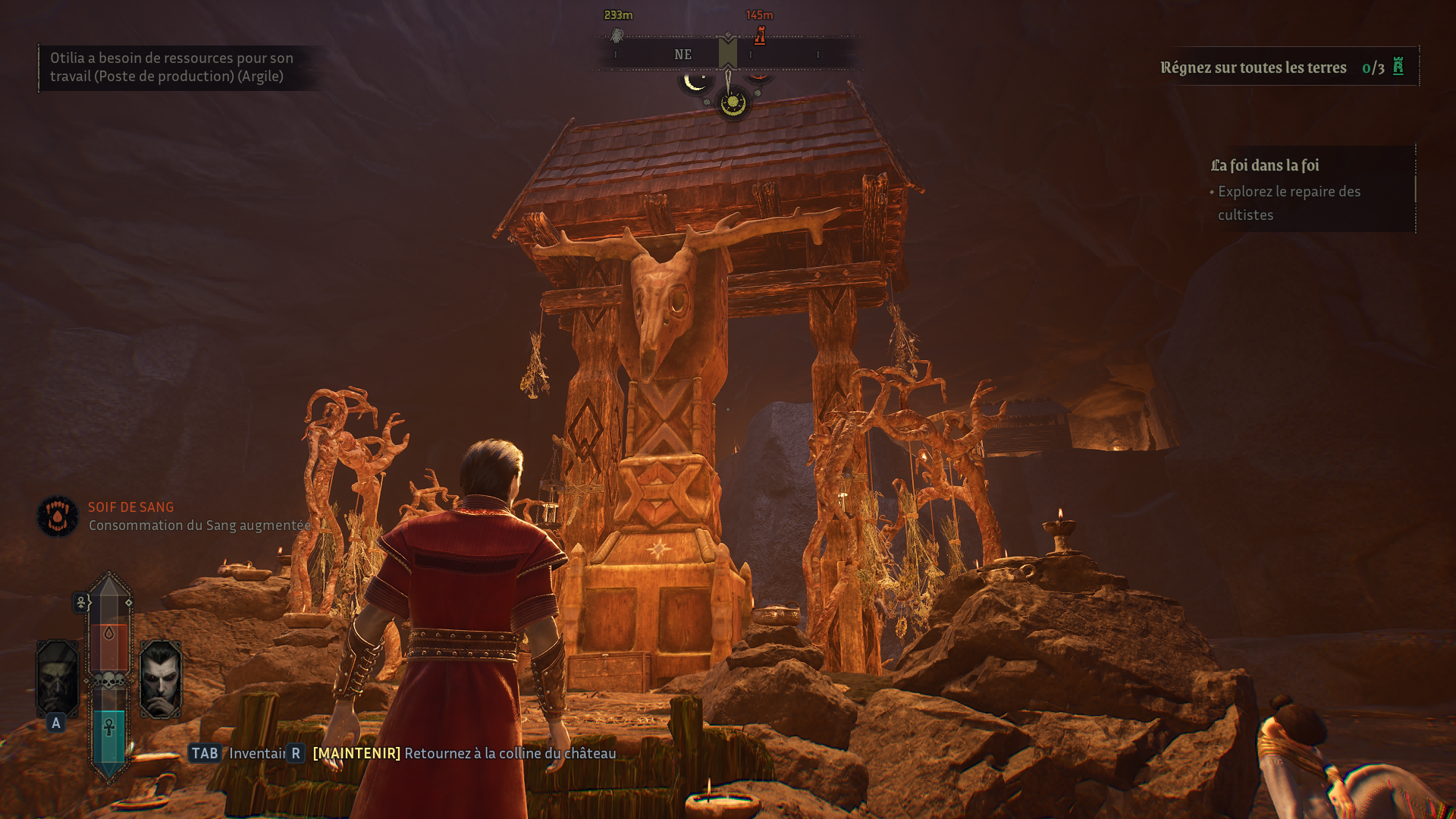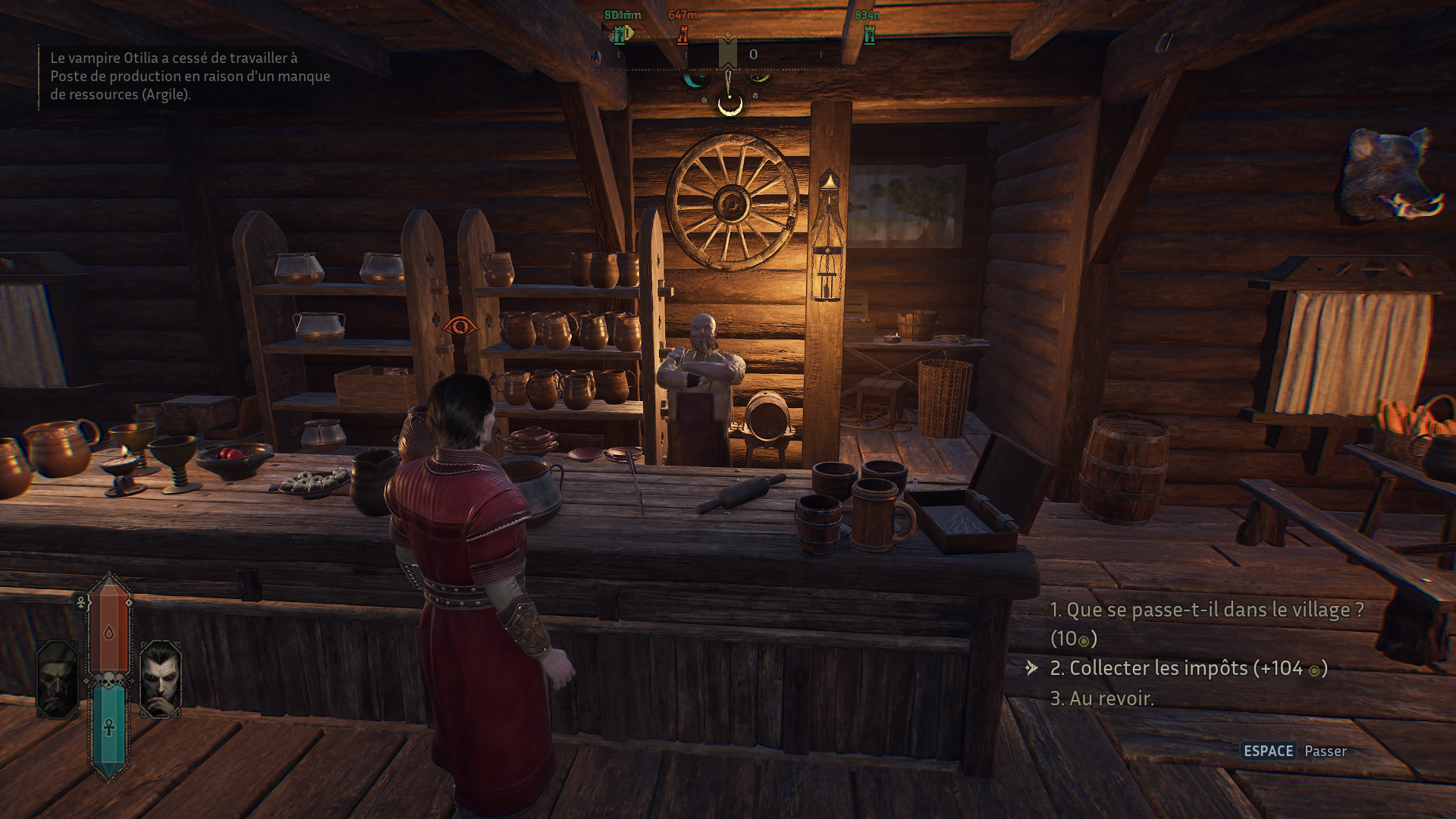 La vraie bonne idée du jeu réside dans ses deux formes jouables. La forme du chasseur est rapide et violente. C’est la seule qui permet de se nourrir et de transformer les humains. Mais si vous êtes repéré, les paysans fuient et alertent l’Inquisition. Les revenus générés par les taxes de la région chutent. La forme aristocrate est, elle, plus subtile. Impossible de se nourrir, mais elle permet d’interagir avec les mortels. Vous pouvez discuter, écouter des rumeurs et identifier les paysans les plus intéressants à convertir. Cette mécanique apporte une vraie tension. Elle oblige à observer, planifier et alterner intelligemment entre prédation et infiltration. En bref, même ici on respecte la mascarade.