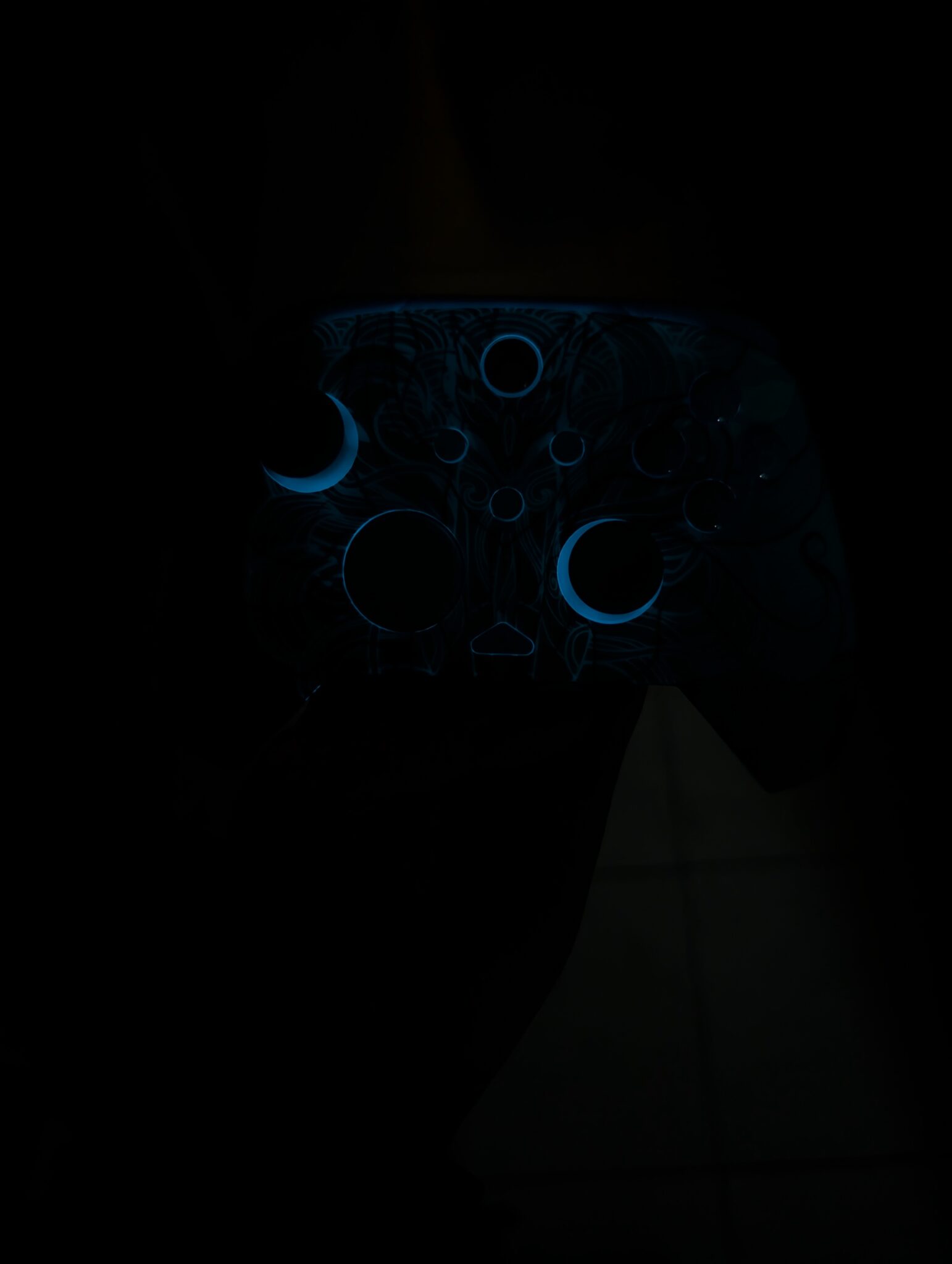 La première chose qui frappe, c’est évidemment ce bleu vif rehaussé d’un motif Kitsune stylisé, presque « cosmic fantasy », qui prend toute sa dimension lorsque la lumière baisse. La manette devient alors une sorte de totem gamer phosphorescent, une trouvaille qui évoque un mélange entre culture pop japonaise et esthétique cyber. On aime ou on n’aime pas, mais au moins, elle assume. Et dans un marché saturé de manettes noires, blanches ou « urban camo », ça change. La prise en main, elle, reste familière : on est sur une ergonomie très proche de la manette Xbox officielle, ce qui permet de s’adapter instantanément. Le châssis est plus léger que celui d’une manette sans fil, mais l’équilibre reste bon, sans effet « creux ». Après, ça, c’est aussi une question d’habitude et de goût.
