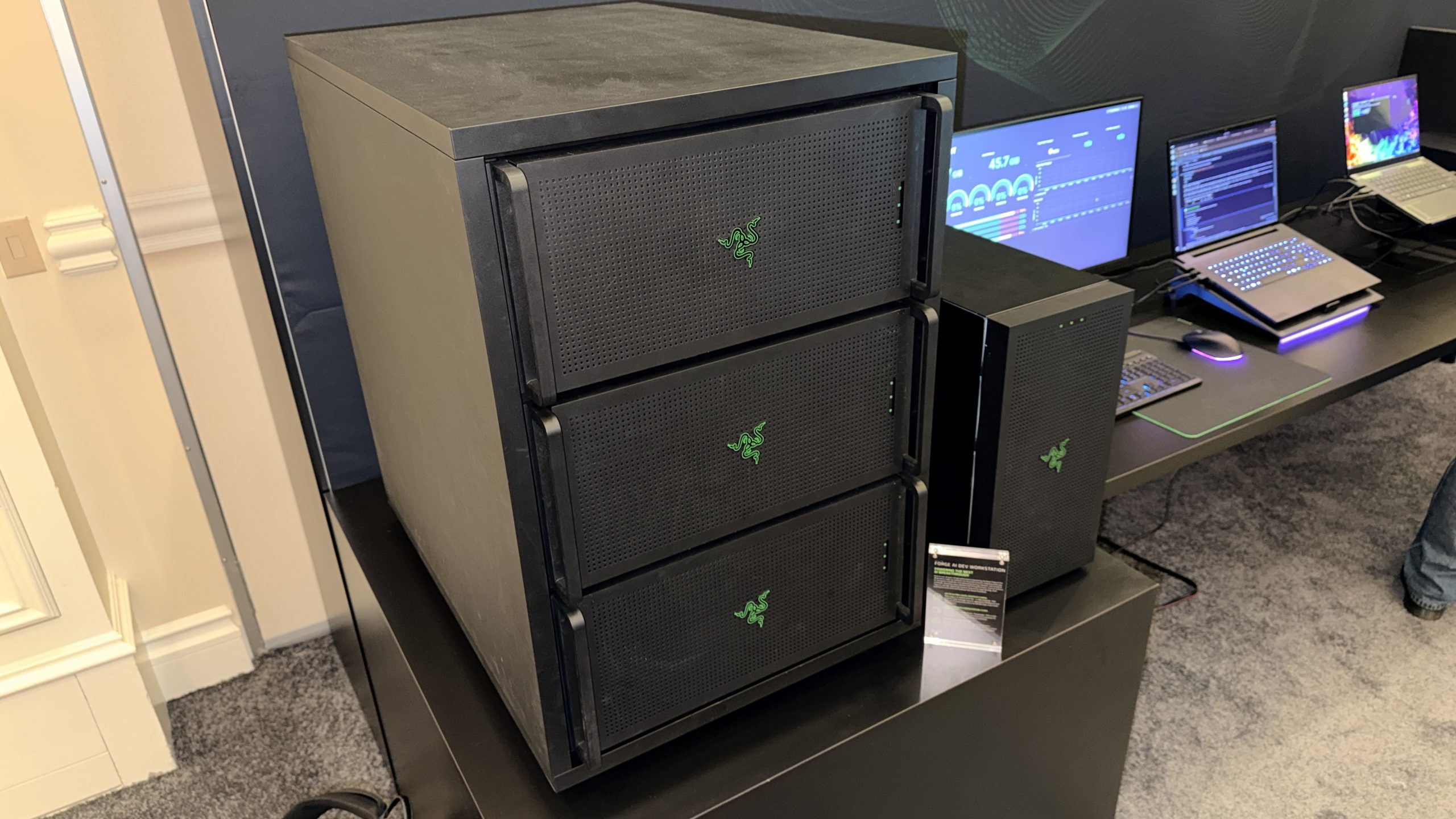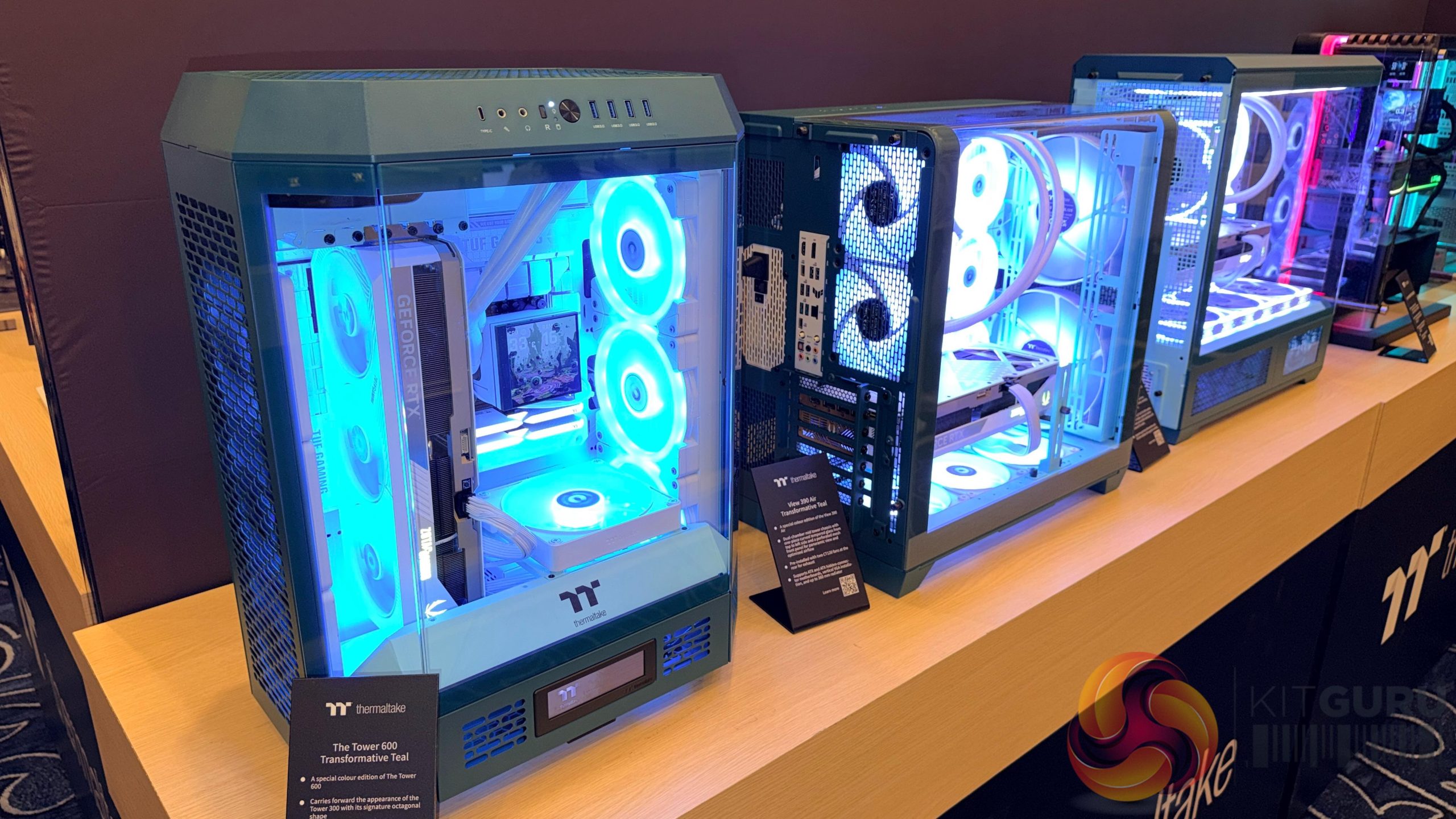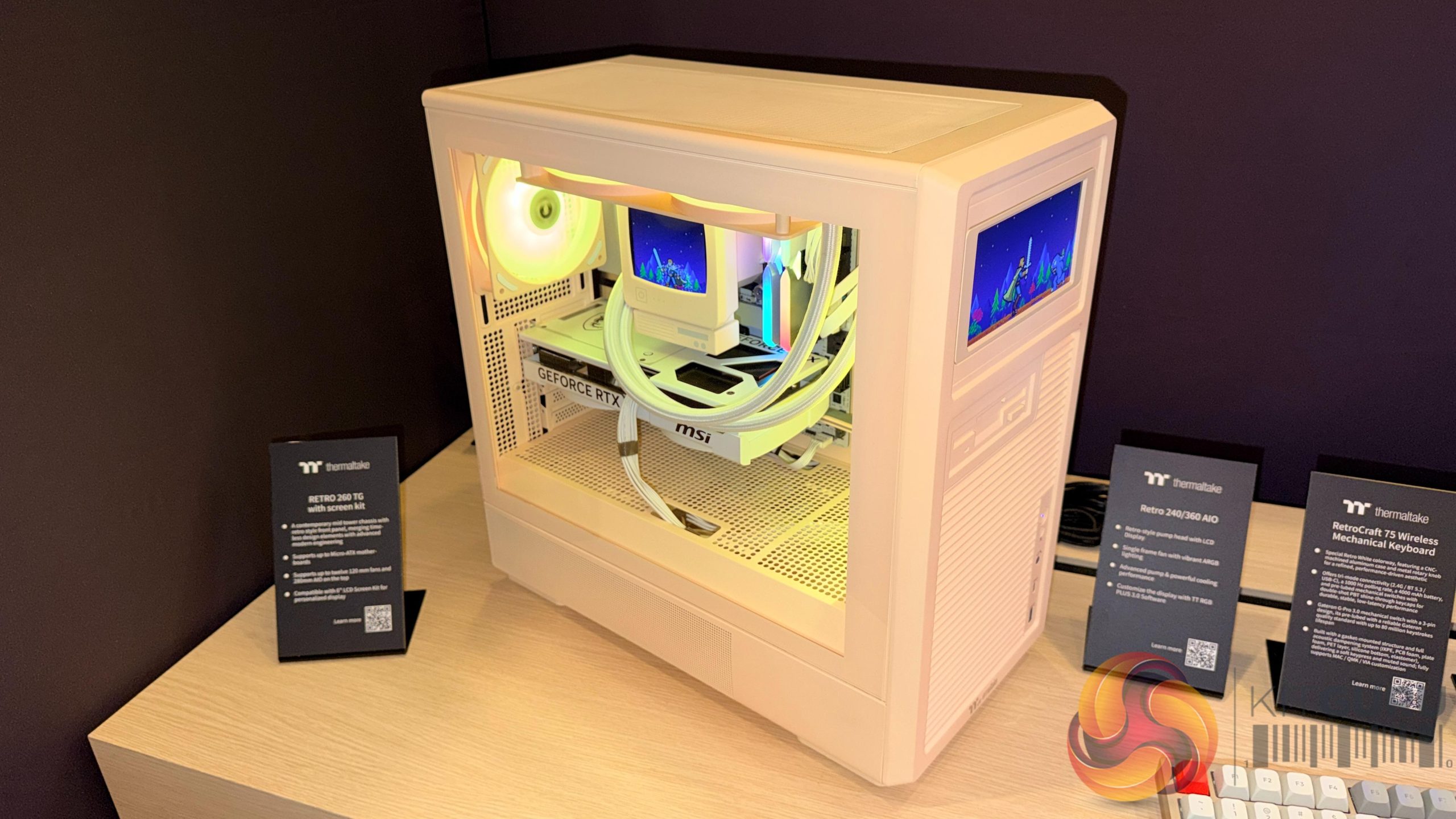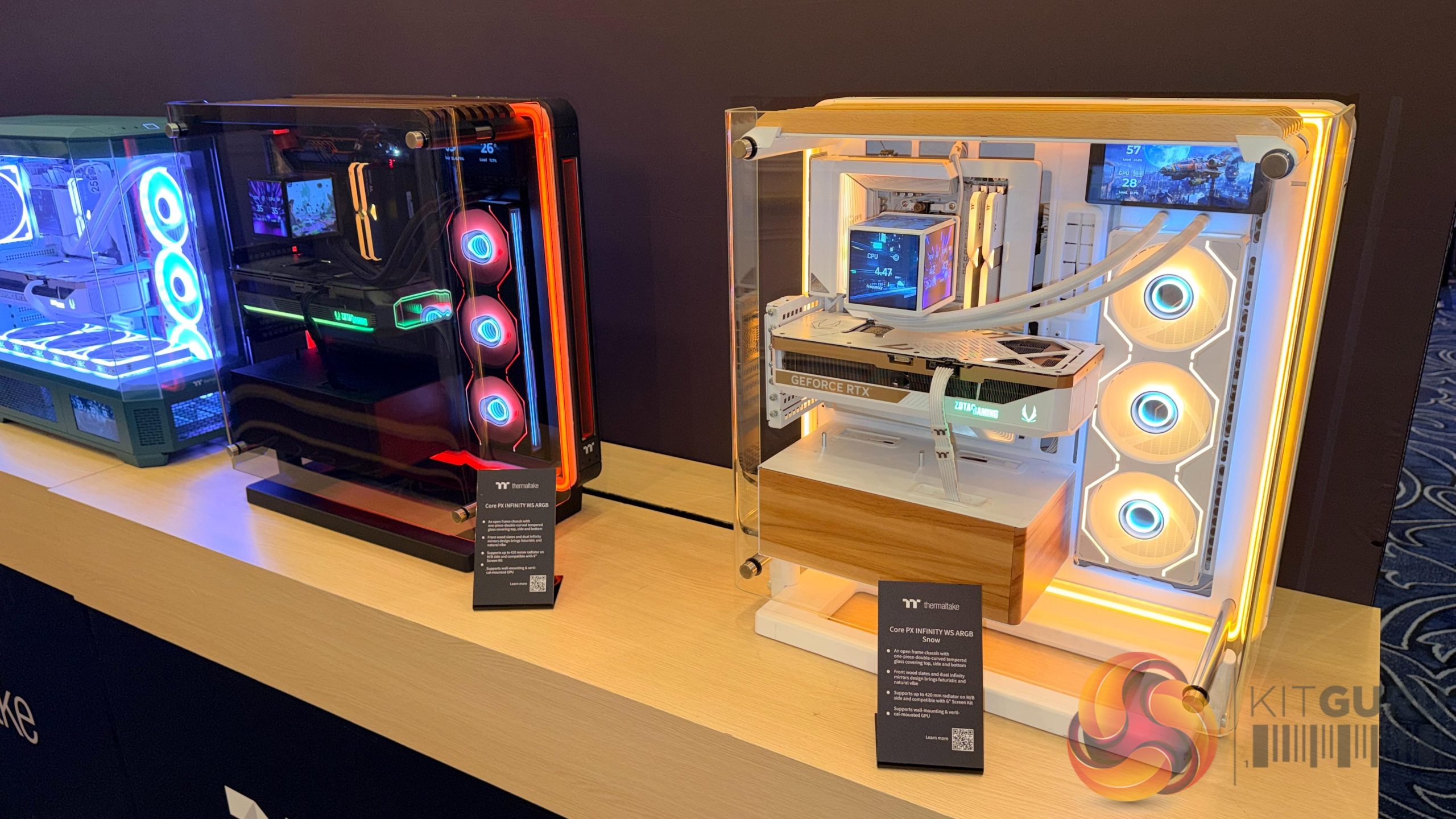 Lian Li’s desk‑style chassis also returned in updated form. The DK‑07 Wood and DK‑B models were shown with revised layouts, including sliding or retractable system compartments and integrated display elements.