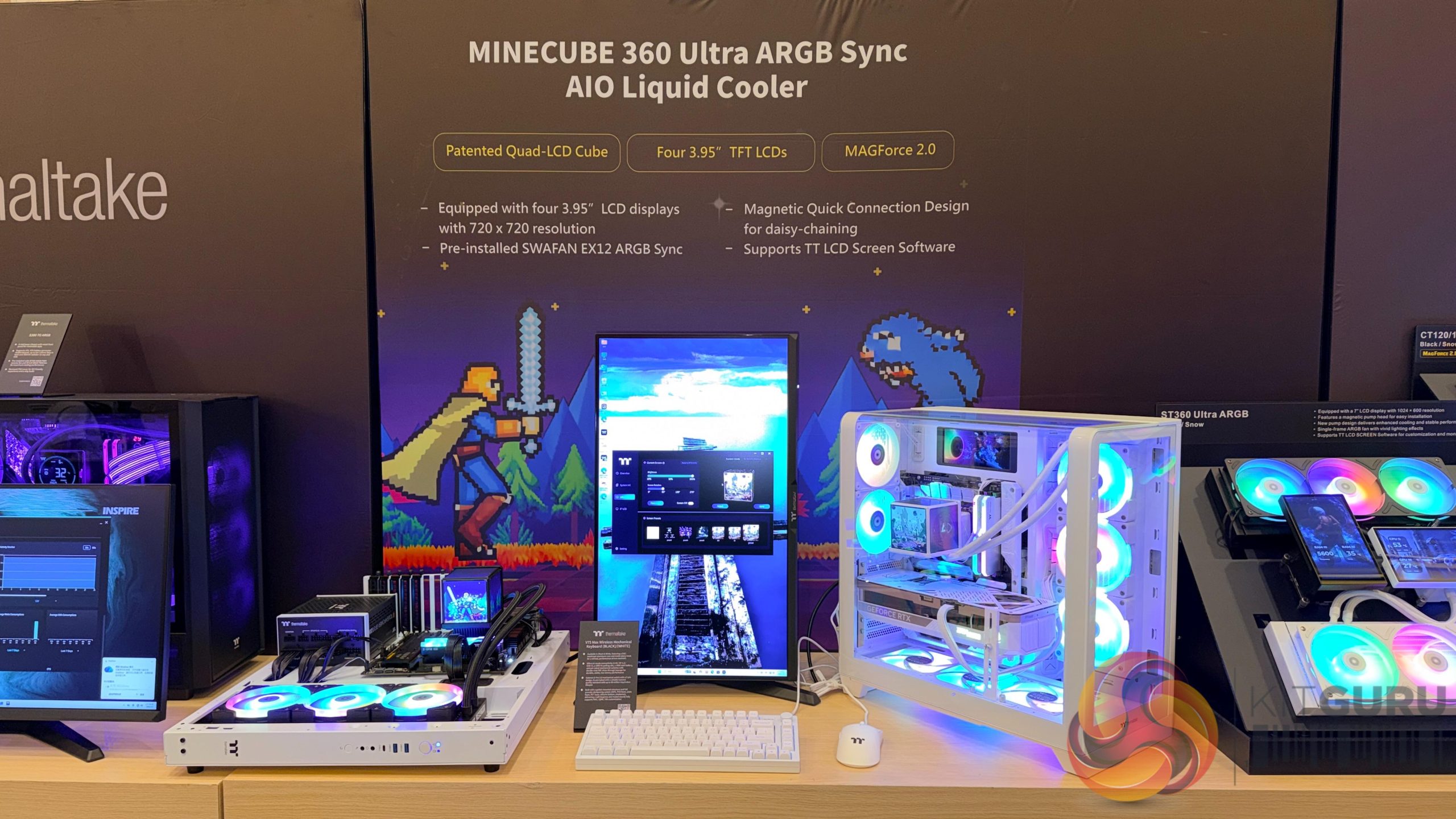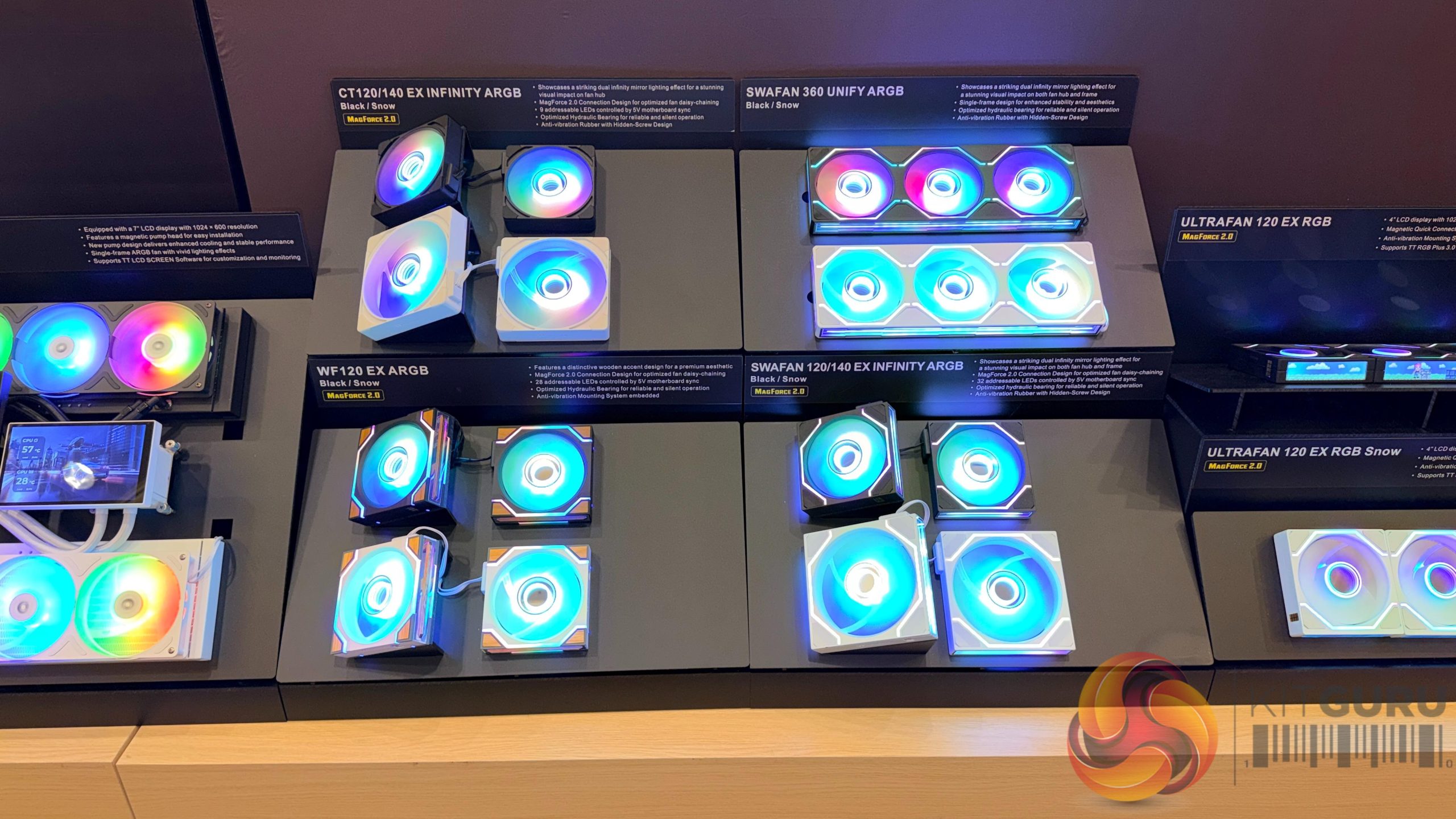 Cooling hardware was another major part of the booth, with new UniFan models drawing significant attention. Lian Li demonstrated its latest FLEX‑series fans, including versions equipped with LCD hubs and updated interlocking mechanisms designed to simplify cable management. These new models build on the UniFan concept with more flexible configurations and expanded visual options, giving builders additional ways to customise both airflow and aesthetics. The company also displayed the HydroShift II LCD CURVED 360 AIO, featuring a movable curved display integrated into the pump housing — a notable evolution of the HydroShift concept that was previewed late last year.