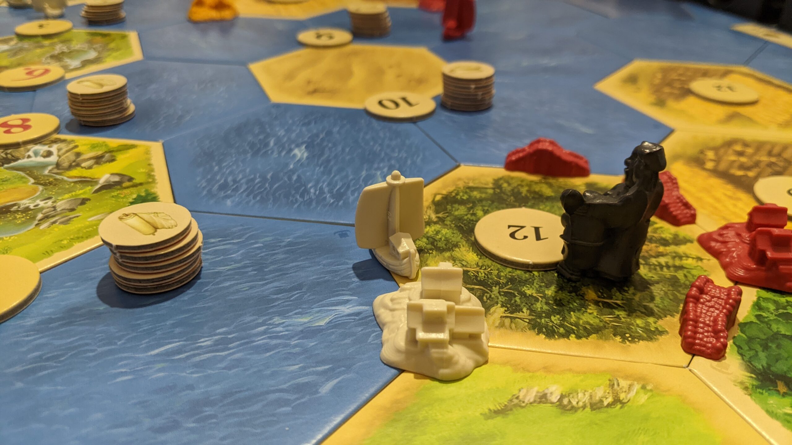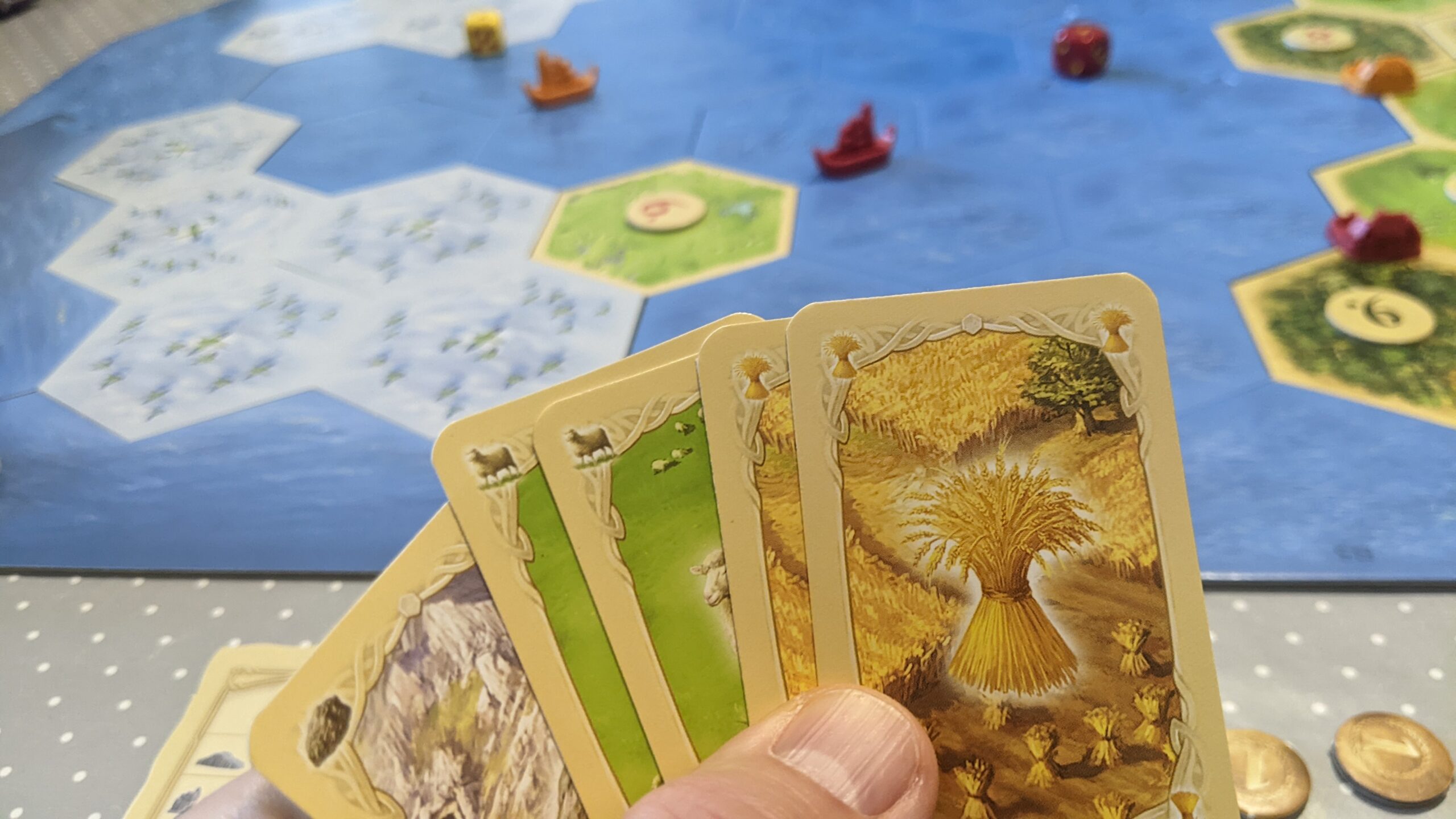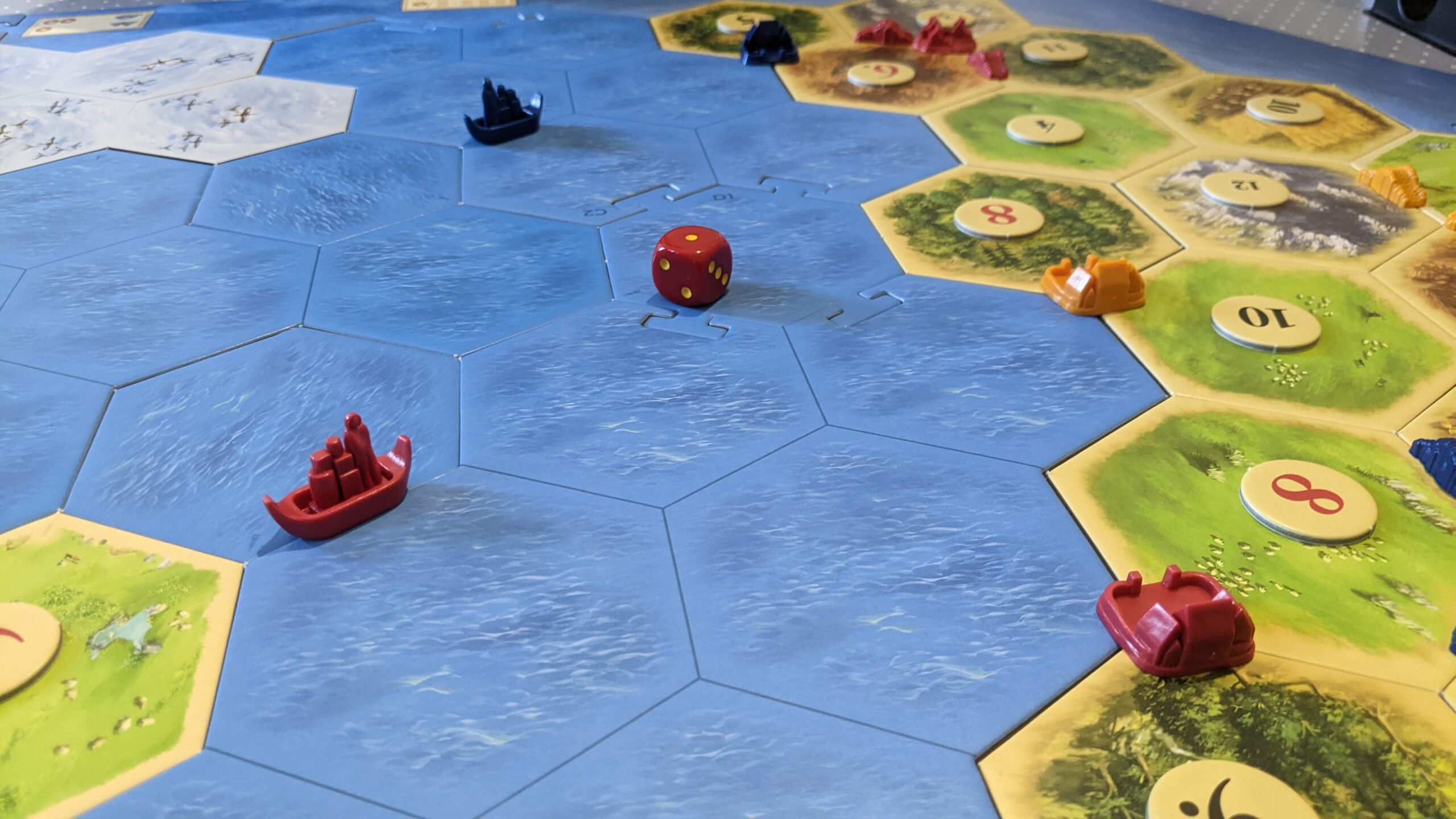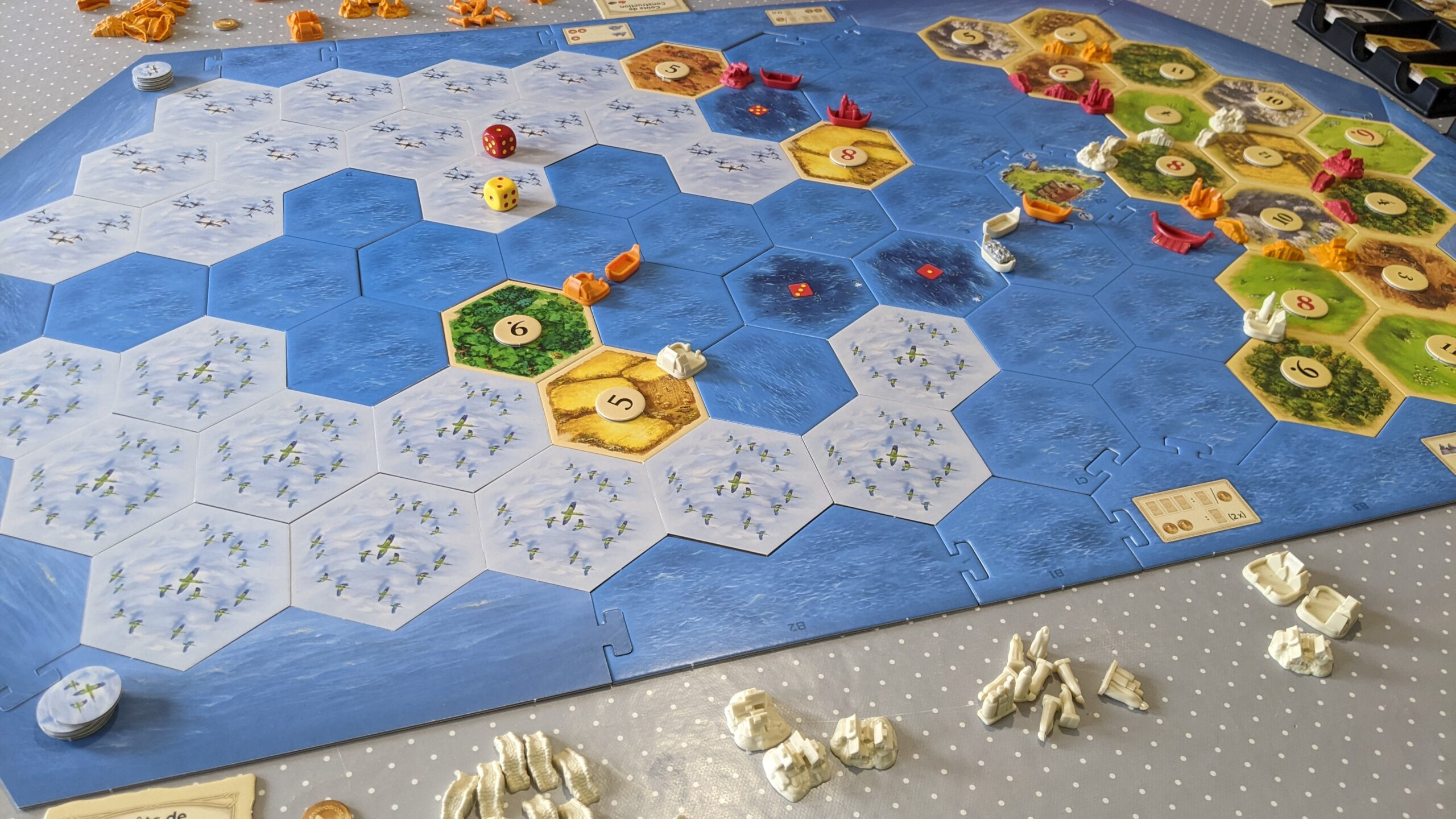 On profite également de possibilités annexes pour gagner des points (car oui, je ne vous l’ai pas précisé mais pour gagner, selon les scenarios joués, il faut atteindre un certain nombre de points sachant qu’une colonie vaut 1 point, une ville 2 par exemple et on peut gagner des points en tirant des cartes développement par exemple ou en réussissant des défis (route la plus longue par exemple…). Ces possibilités annexes donc, sont par exemple la possibilité de pêcher du poissons ou bien récolter d’autres ressources à terre pour faire du commerce.