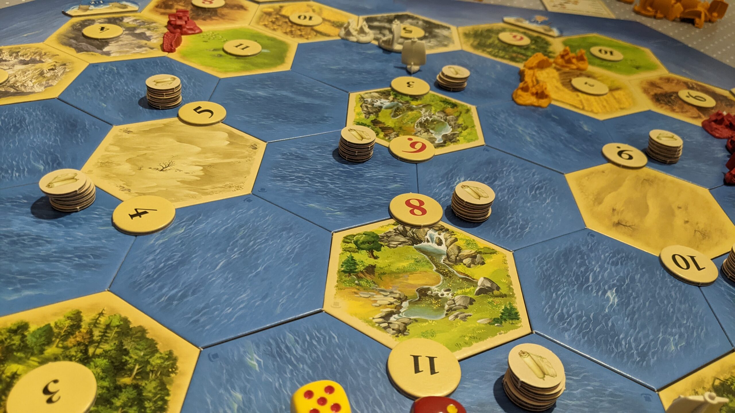 Pour rappel, Catan est un jeu de conquête de territoire qui se joue de 3 à 4 joueurs (il existe des extensions pour 5/6 joueurs ainsi qu’un mode 2 joueurs dans l’extension Pirates et Découvreurs). Le plateau de jeu se présente sous forme de tuiles mobiles qui représentent des ressources (bois, pierre, argile, paille, laine…). Ces mêmes ressources sont obtenues par le lancé des dés. En effet, chaque tuile dispose d’un chiffre déterminé au départ. Pour en bénéficier il fout donc avoir construit des colonies (ou villes, leur évolution) aux abords des des tuiles. Pour évoluer il faudra construire des routes, etc.. Chaque construction nécessite l’addition de ressources précises.