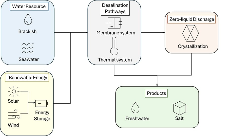 In this work, the researchers show how desalination of brackish groundwater can be made genuinely sustainable and economically viable for addressing the United States’ looming water shortages. A key part of the solution is zero‑liquid‑discharge, which avoids brine disposal by extracting more freshwater and recovering salts such as sodium, calcium, and magnesium for reuse. Crucially, the study demonstrates that when desalination is powered by low‑cost solar and wind energy, the overall process becomes far more affordable. By 2040, solar photovoltaics paired with optimised battery storage are projected to produce electricity at lower cost than the grid in the states facing the largest water deficits, making renewable‑powered desalination a competitive option.