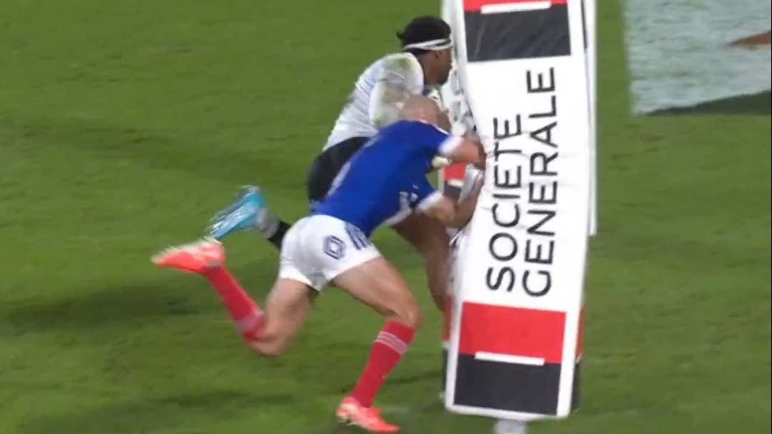 Le demi de mêlée de Bordeaux-Bègles est revenu sur cette action cocasse où il finit sur la protection en mousse des poteaux en voulant défendre sur l’ailier fidjien Ravouvou.
