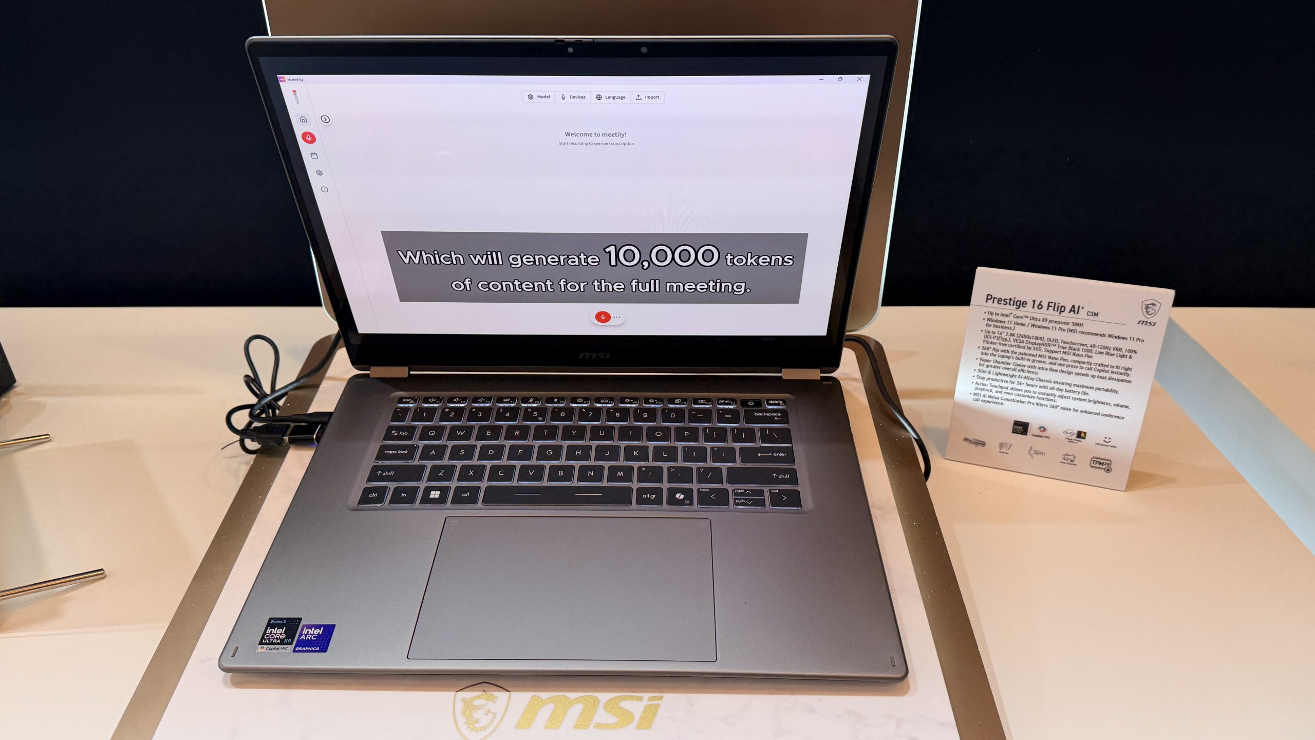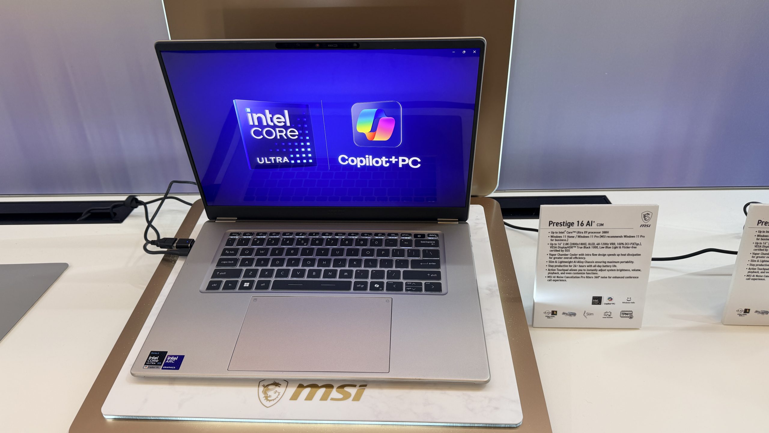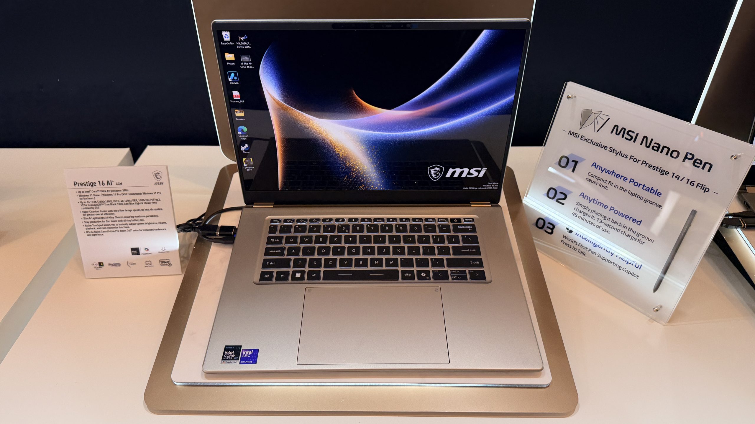 The Prestige 14 and 16 Flip extend the same hardware into a 2‑in‑1 form factor with touchscreens and stylus support. MSI includes its new Nano Pen, which docks into the chassis for charging and can deliver 45 minutes of use from a 15‑second top‑up. As part of a collaboration with Microsoft, the pen also supports a Copilot press‑to‑talk shortcut for voice input. The Flip models add a larger touchpad with custom gesture zones, enterprise‑grade security features, and an optional 2.8K 120Hz OLED display with DisplayHDR True Black 1000 certification.