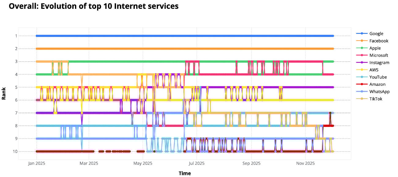 Le rapport explique qu’Apple est restée solidement accrochée à la 3e place pendant la majeure partie de l’année, une place qu’elle a décroché en dépassant TikTok. Elle s’est ensuite fait concurrencer par Microsoft certains jours d’été, mais malgré ces échanges de places, elle conserve la médaille de bronze. Pendant ce temps, TikTok a reculé à la 8e place tandis que Microsoft a progressé par rapport à 2024.