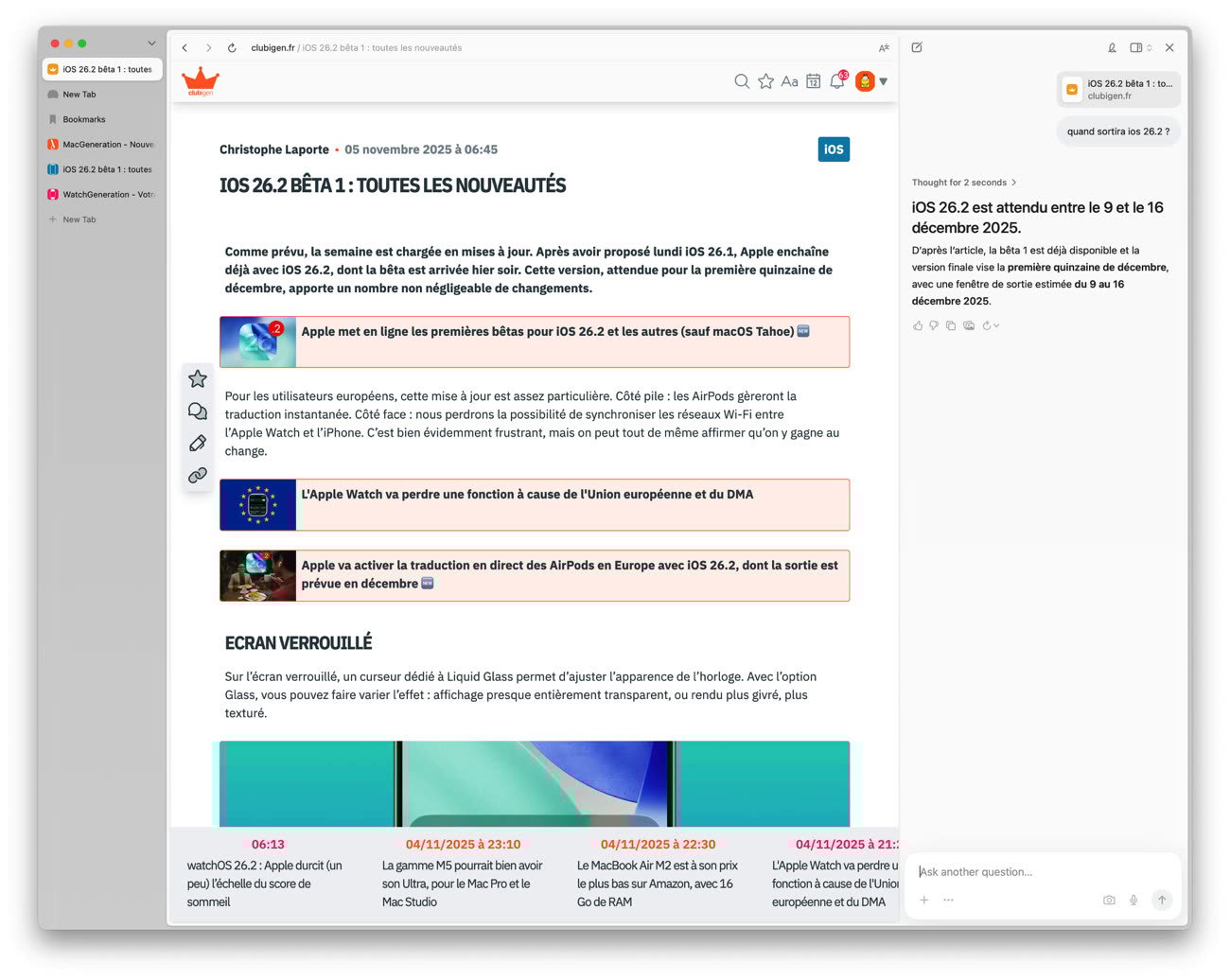 La version 26.1, et là encore c'est une tradition, était là pour corriger les errements d'une nouvelle version d'un système d'exploitation. Elle permet par exemple de réduire les effets liés à Liquid Glass, apparu avec iOS 26 et les autres. La version 26.2, elle, ne devrait pas amener de nouvelles fonctions importantes, mais corriger des bugs et préparer les variantes suivantes.