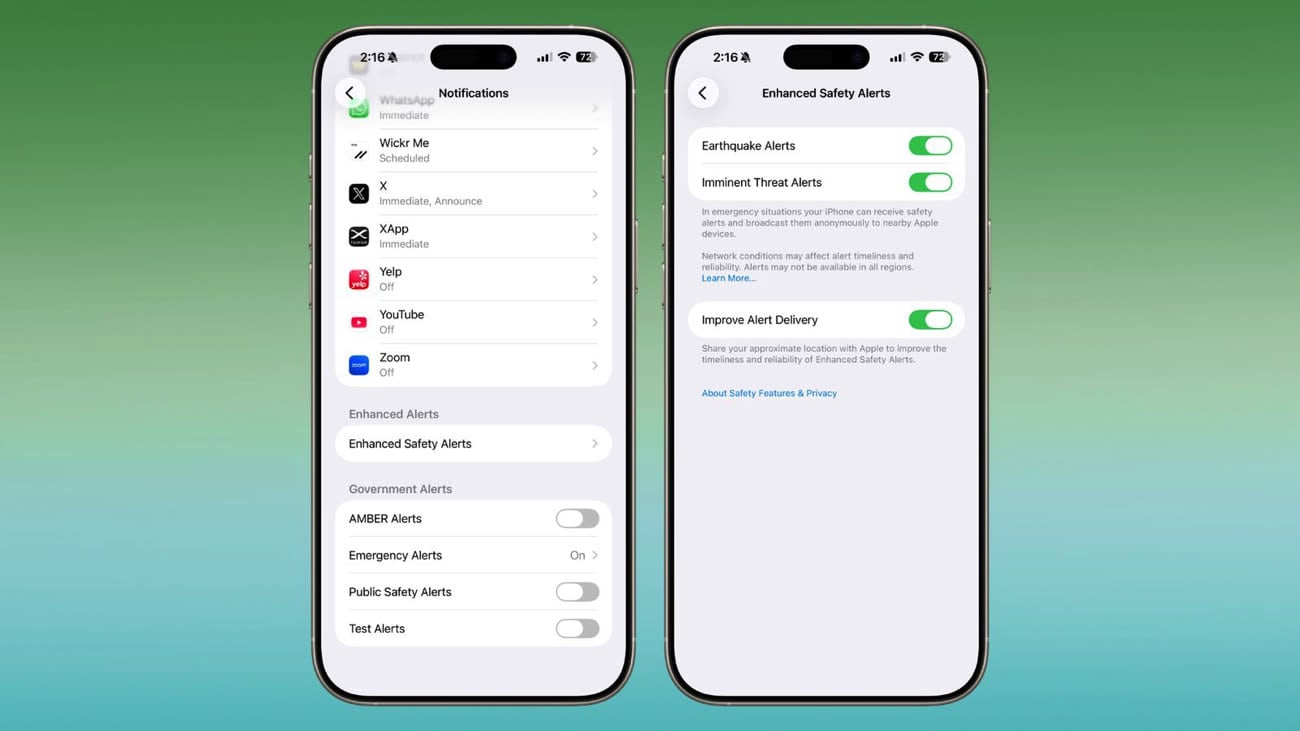 Dans la section Notifications des réglages, un nouvel onglet Alertes de sécurité améliorées permet de gérer les alertes liées aux tremblements de terre, aux menaces imminentes, ainsi que d’activer une meilleure diffusion des alertes. Cette dernière option s’appuie sur votre position afin d’en améliorer la fiabilité.
