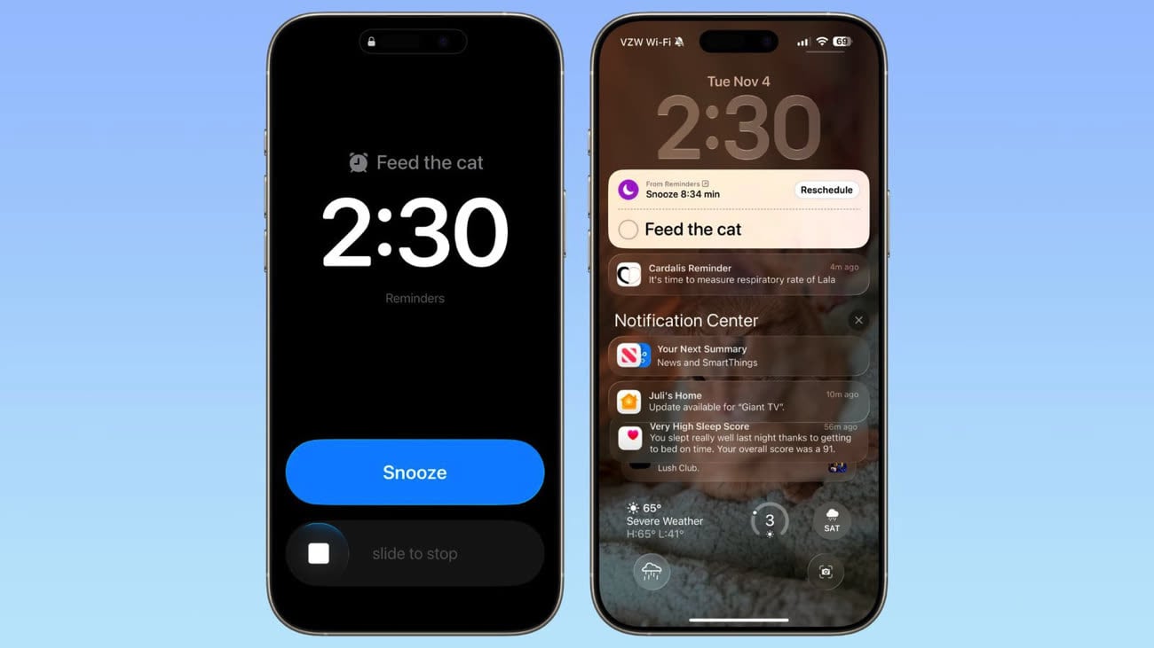 Quand l’alarme d’un rappel se déclenche, vous avez le choix entre Répéter (snooze) ou Arrêter. Si vous choisissez de répéter, un compte à rebours apparaît sur l’écran verrouillé, avec la possibilité de marquer le rappel comme terminé ou de le reprogrammer.