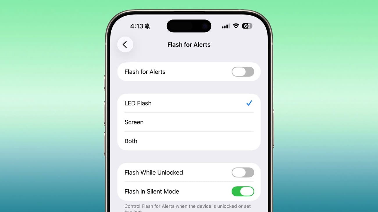 Dans les réglages d’Accessibilité, l’option Flash pour les alertes peut désormais faire flasher l’écran. Jusqu’ici, elle se limitait uniquement au flash LED au dos de l’iPhone.