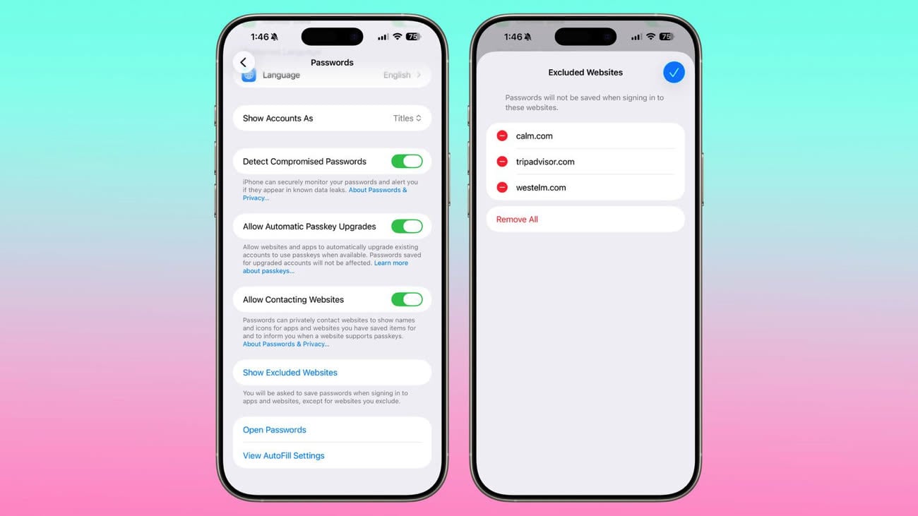 Dans les réglages de l’app Mots de passe, on trouve désormais une option permettant de gérer la liste des sites pour lesquels l’iPhone ne doit pas enregistrer les identifiants lors de la connexion.