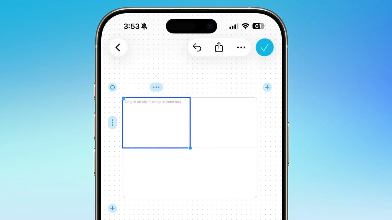 Les tableaux débarquent dans Freeform comme un outil supplémentaire parmi les nombreux déjà proposés. Depuis l’écran d’ajout de contenus, vous pouvez créer des tableaux de différentes tailles et y insérer du texte ou des listes.