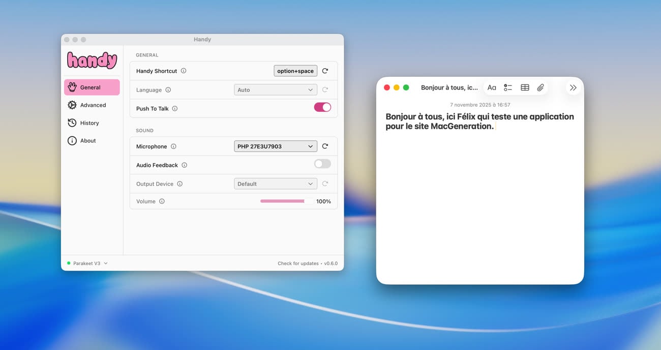 L’app vient ensuite se nicher dans la barre des menus, et peut être activée via un raccourci clavier (⌥Espace par défaut). Il suffit alors de mettre son curseur dans une zone de texte et de parler : le texte est automatiquement transcrit. Le modèle recommandé Parakeet V3 m’a semblé très efficace sur mon MacBook Air M1. La transcription est fiable, même s’il s’est emmêlé les pinceaux sur certains mots spécifiques (MacGeneration devient « ma génération » si on le dit un peu vite). Cela reste surprenant de rapidité.