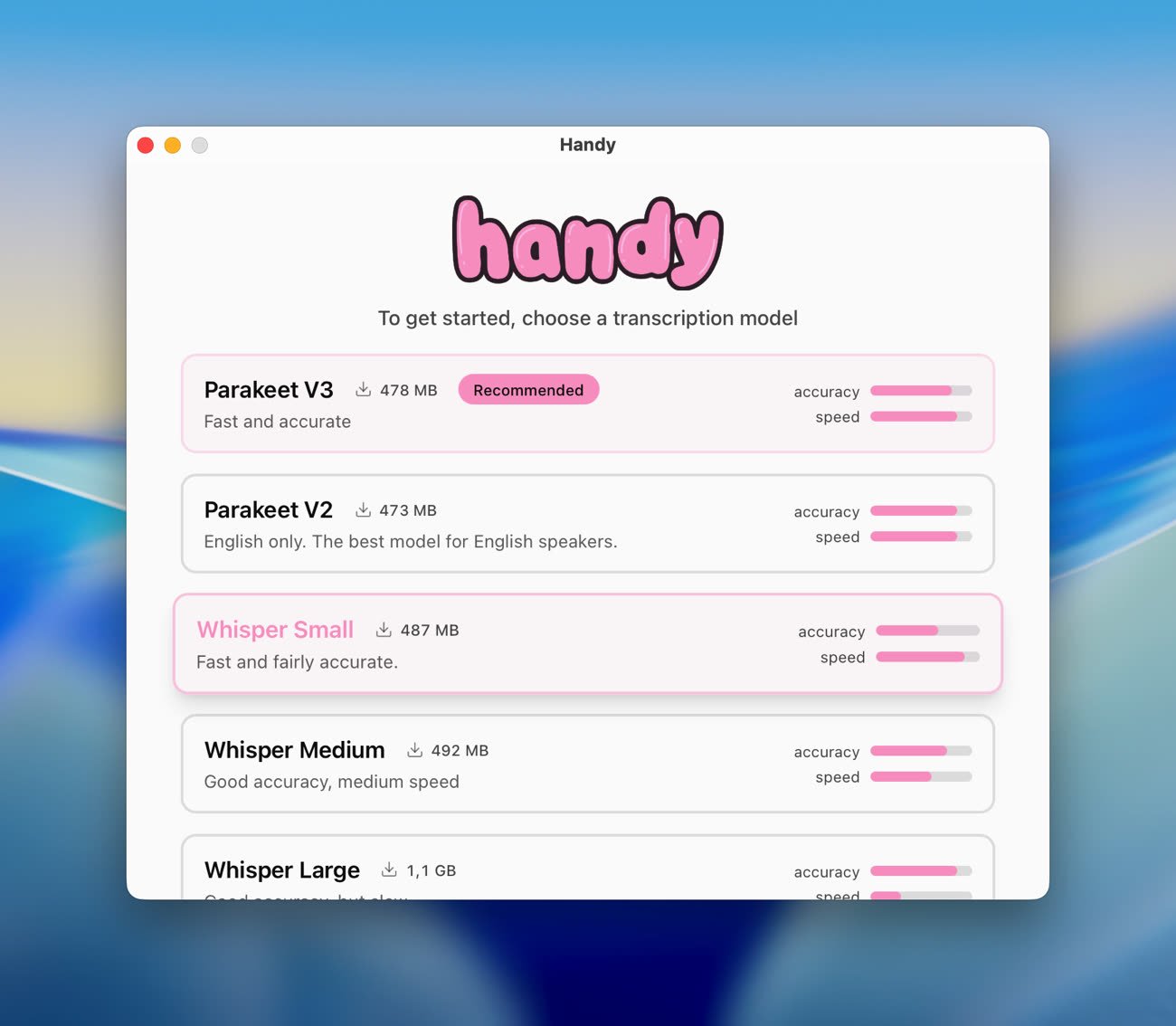 Le premier lancement implique de laisser l'accès au micro ainsi qu’aux paramètres d’accessibilité de macOS. On doit alors choisir un modèle de transcription parmi une liste claire, chacun ayant ses forces et faiblesses. On y retrouve le Whisper d’OpenAI, mais aussi Parakeet, développé par NVIDIA et recommandé car étant considéré comme le plus rapide tout en étant aussi fiable que la concurrence.