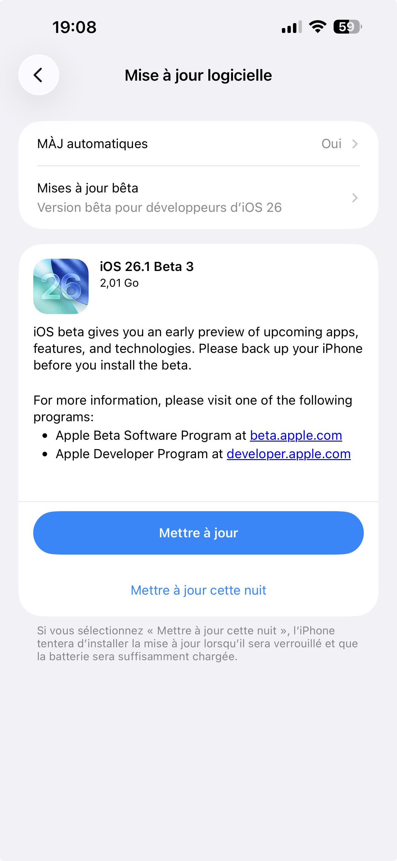 Grosse soirée pour les développeurs : Apple vient de mettre en ligne une nouvelle bêta pour ses différents systèmes d’exploitation. Il s’agit d’une troisième bêta pour iOS 26.1, iPadOS 26.1 et macOS 26.1. watchOS 26.1 et visionOS 26.1 sont également de la partie, tout comme tvOS 26.1. Nous allons installer tout cela et vous tiendrons au courant des nouveautés.