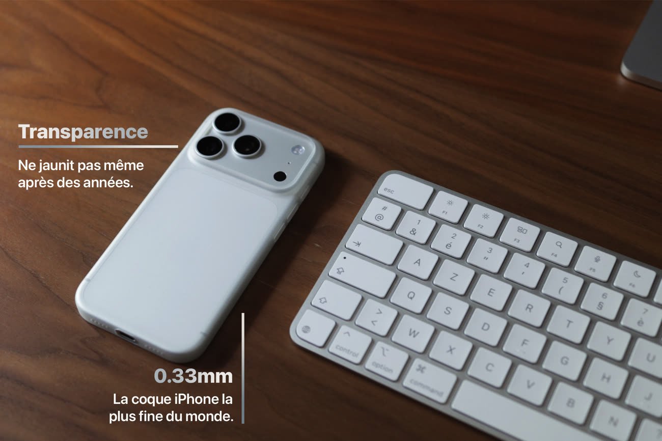 La PHANTOM détient le titre de coque transparente la plus fine au monde. Avec ses 0,33 mm d'épaisseur, elle se fait oublier tout en protégeant des rayures et des petits chocs du quotidien. Le matériau utilisé ne jaunit pas, même après des années d'utilisation intensive. Fini les coques qui virent au beige douteux au bout de six mois.