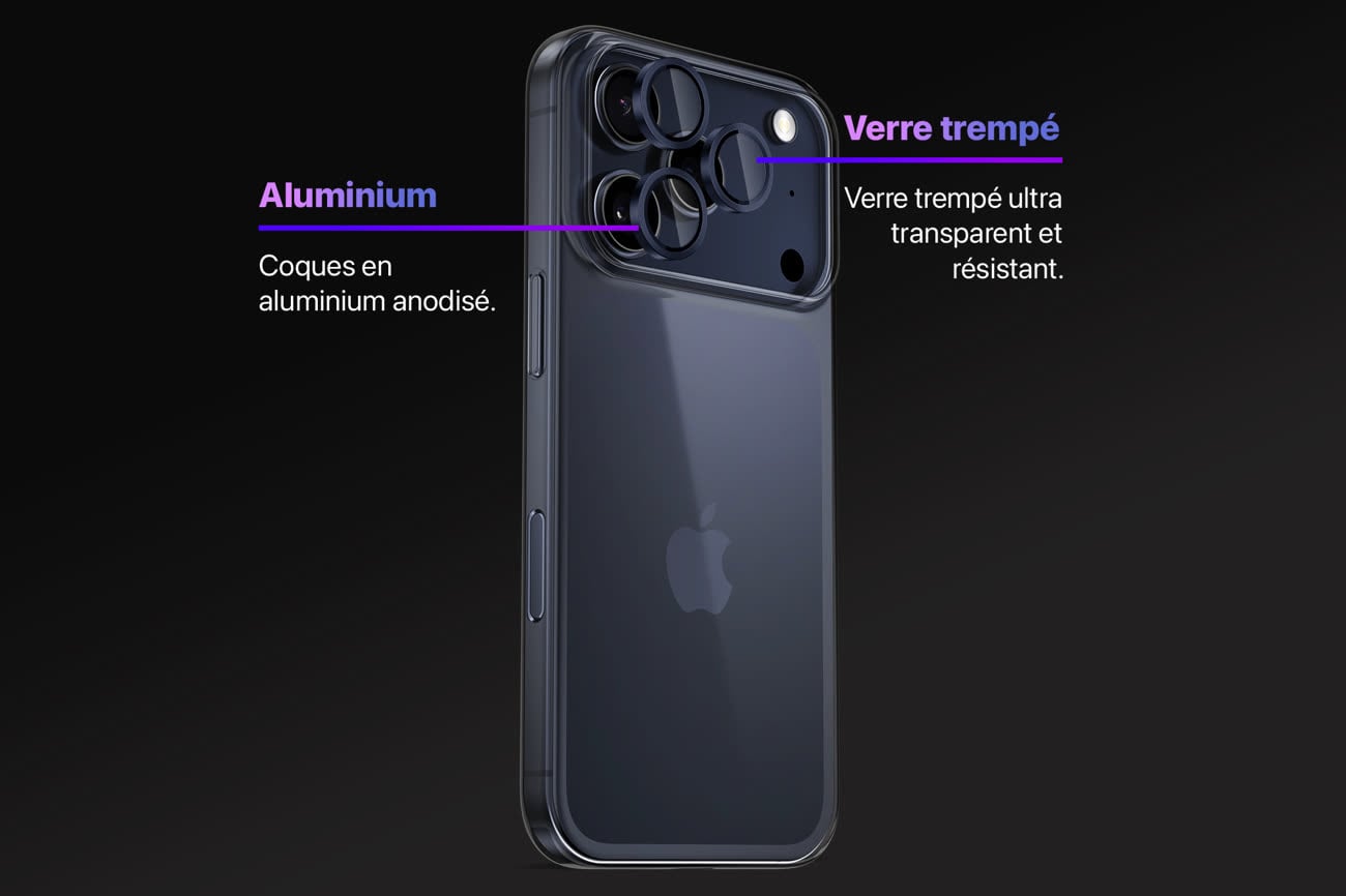 Le verre conserve une transparence totale qui n'altère pas la qualité des photos. Pas de teinte parasite, pas de flare ajouté, pas de perte de netteté. Les anneaux métalliques encadrent chaque objectif en absorbant les chocs si le téléphone tombe côté caméra. Une fois installée, cette protection devient invisible mais efficace.