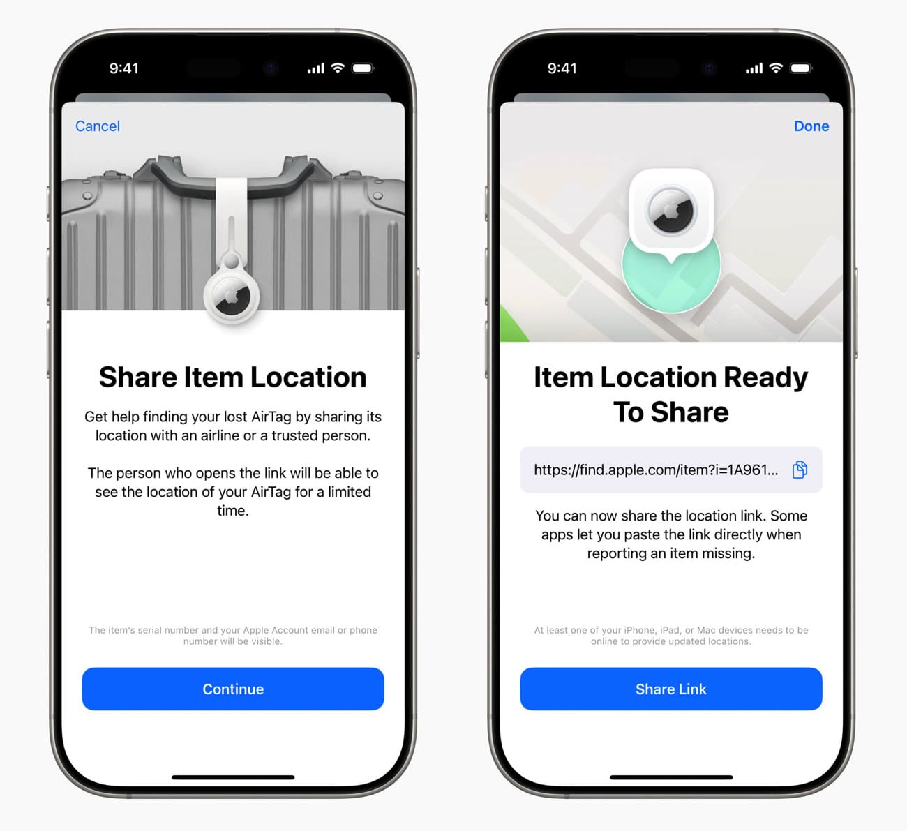 Partage de la position d’un AirTag avec une compagnie aérienne. Image Apple.