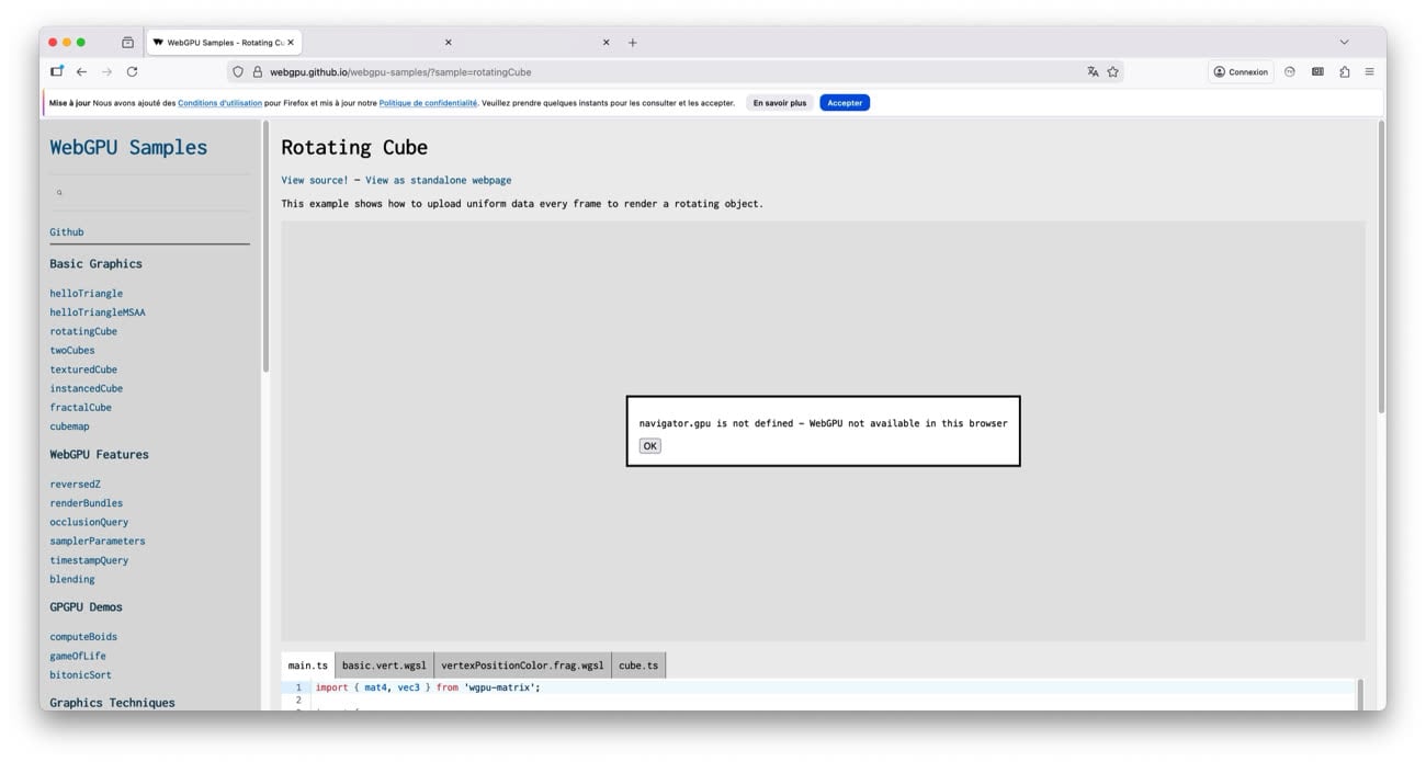 La version 141 de Firefox activait WebGPU sous Windows, la version 147 le fait pour les Mac, mais uniquement ceux équipés d'une puce Apple Silicon. Sur les Mac Intel, il faudra encore probablement attendre : pour le moment ce n'est pas actif. Mozilla n'indique pas si la prise en charge est prévue, mais c'est probablement le cas. Si vous tapez about:config dans la barre d'adresse puis que vous activez la valeur dom.webgpu.enabled (en la passant de false à true), les démonstrations en WebGPU fonctionnent.