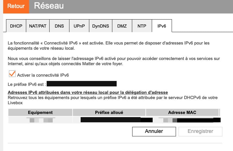 Pour appliquer ce contournement, lorsque vous êtes connecté à votre réseau domestique, rendez-vous dans l’interface d’administration de votre Livebox accessible à l’adresse 192.168.1.1. Dans la section Réseau, ouvrez l’onglet IPv6 et décochez la case Activer la connectivité IPv6. Désactiver ce protocole ne provoque en principe aucun tracas pour la navigation sur le web, mais cela peut entraîner des dysfonctionnements si vous utilisez des objets connectés Matter.