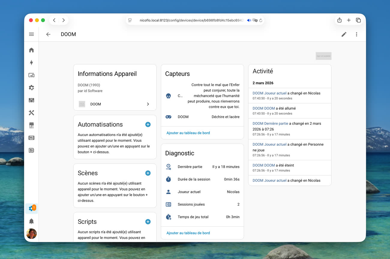 Franck Nijhof ne s’est pas contenté d’afficher le jeu dans une petite fenêtre. Doom devient un appareil Home Assistant à part entière avec ses entités dédiées, dont une qui signale si le jeu est actuellement actif ou non et une autre qui comptabilise le temps de jeu. On peut alors gérer la domotique à partir de ces éléments : changer les lumières quand la partie est en cours, surveiller quel utilisateur joue à tout moment, collecter des statistiques, envoyer des notifications… tant qu’à faire, le développeur a poussé l’idée absurde jusqu’au bout pour en faire un projet complet.