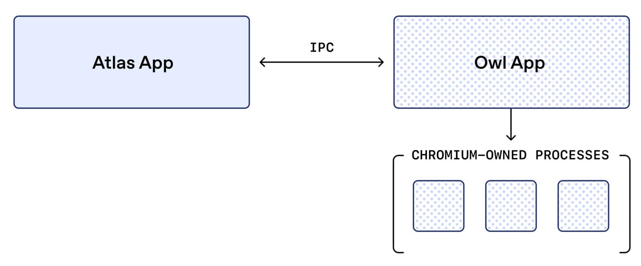 Chromium sert uniquement de fondations pour afficher les pages web, ce qui reste l’activité principale dans un navigateur évidemment. L’entreprise a toutefois décidé de créer sa propre enveloppe, en utilisant du code natif sur chaque plateforme, et en chargeant le moteur de rendu de Google depuis cette enveloppe. Le principe est nommé en interne OWL, pour OpenAI’s Web Layer, et son idée est de séparer aussi strictement que possible Chromium du reste d’Atlas. Concrètement, l’enveloppe est une interface codée en SwiftUI et AppKit pour la version macOS et probablement iOS, les deux frameworks d’interface d’Apple (AppKit est l’historique, SwiftUI le plus moderne).