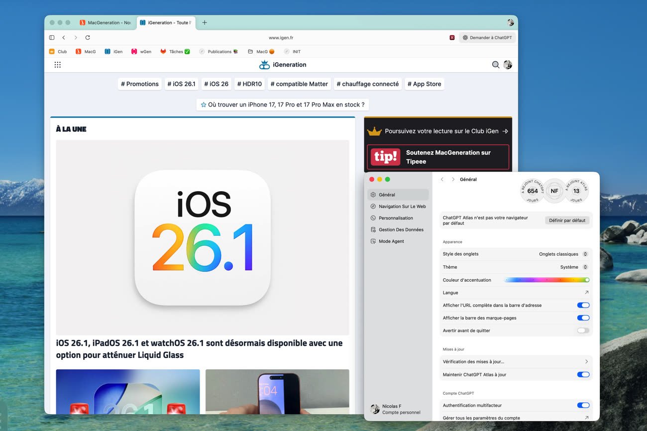Vous pouvez tester ChatGPT Atlas gratuitement, à condition toutefois d’avoir un compte ChatGPT, le navigateur est inutilisable sans cela. Un compte payant est nécessaire pour l’exploiter pleinement et notamment son mode agent, qui manipule les pages web à votre place. Je l’ai testé en guise de navigateur web par défaut pendant une semaine à la place de Safari et j’ai apprécié son interface soignée, même si les fondations fournies par Google sont rapidement visibles.