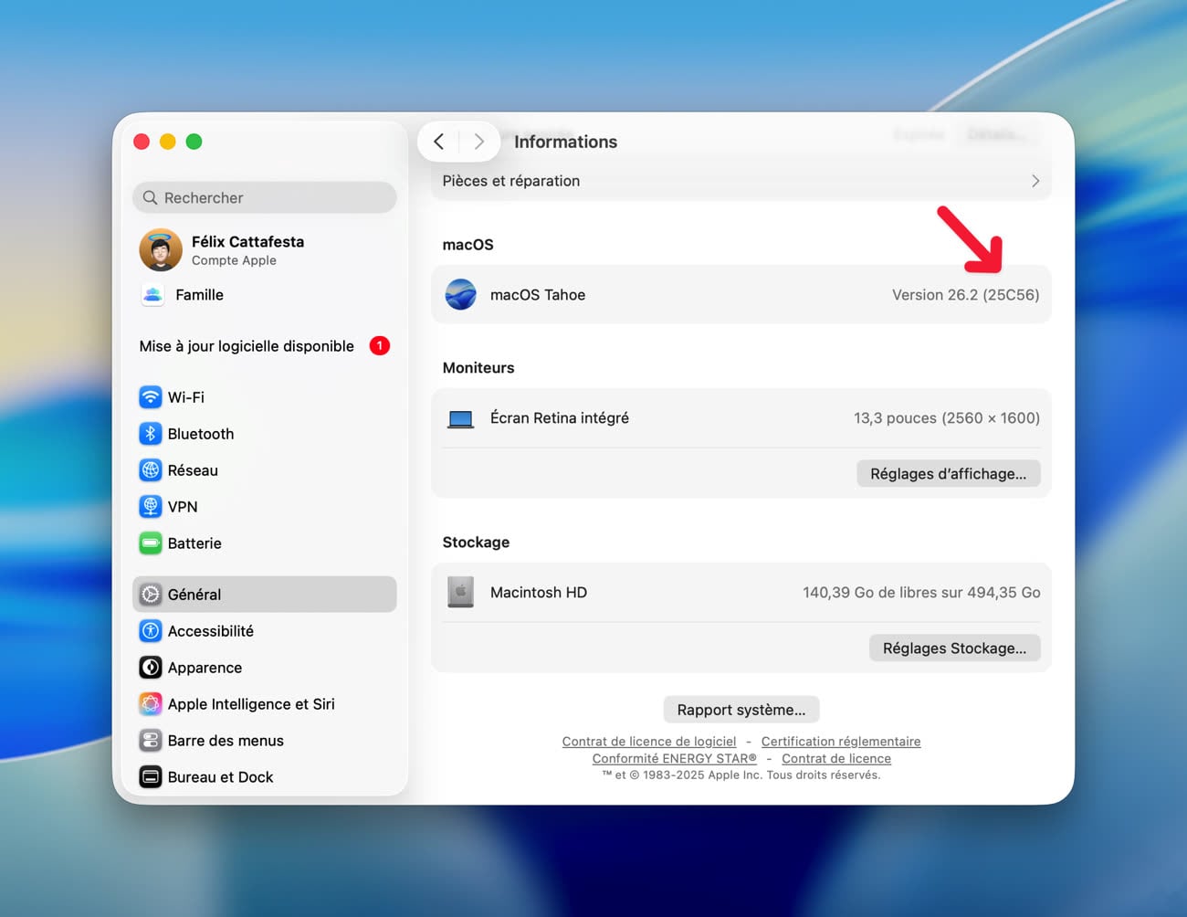 C’est pour cela que l’identifiant de macOS Tahoe 26.2.0 est 25C56 : le nombre 25 correspond au numéro de version de la mouture actuelle de Darwin. Or, depuis 2011, les numéros de version majeurs correspondent aux deux derniers chiffres de l'année de leur sortie. Par exemple, Darwin 11 est sorti en juillet 2011, là où macOS 26 est sorti en septembre 2025. Il y a donc un décalage.