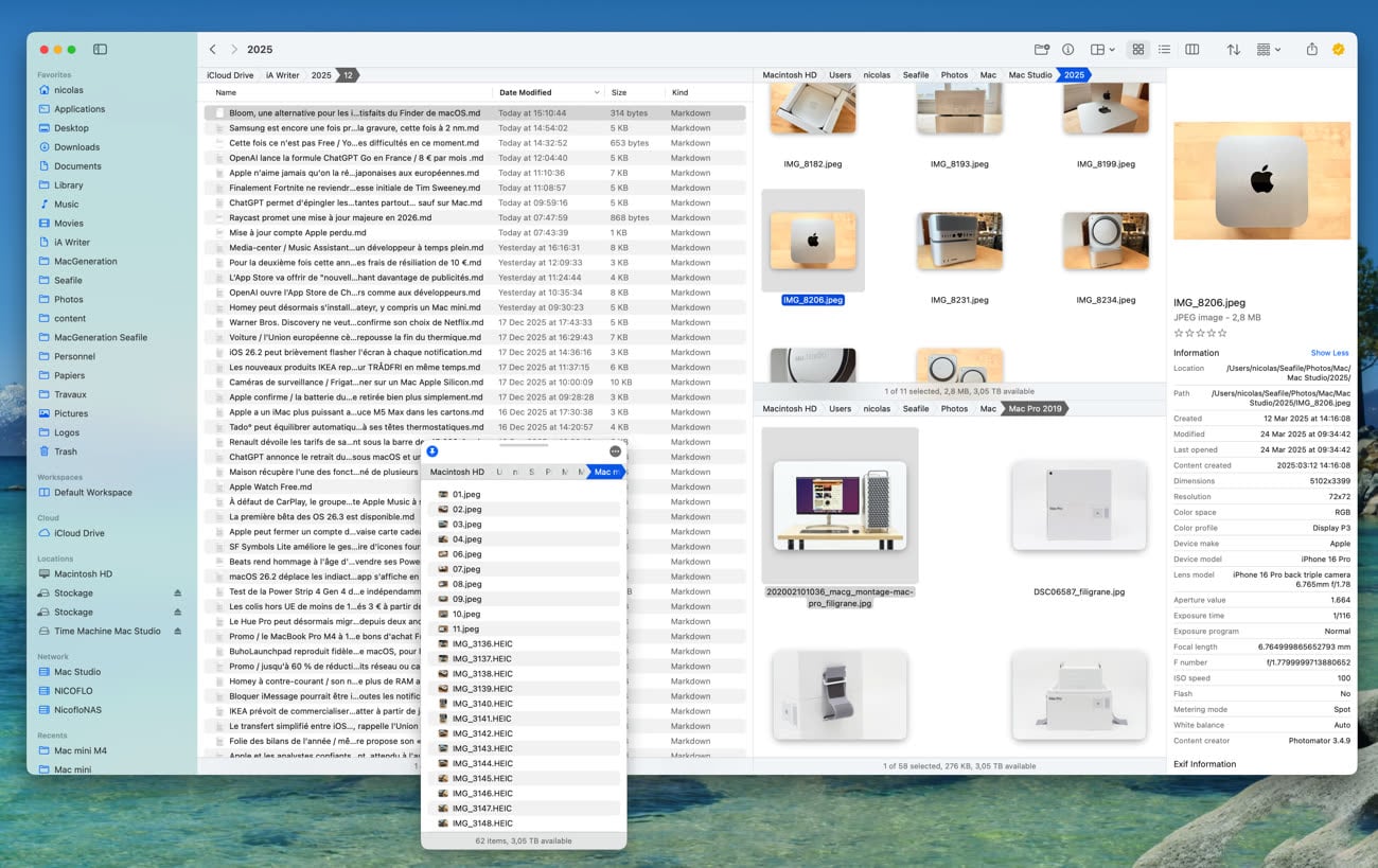 Bloom en action avec ici trois panneaux dans une seule fenêtre, plus la petite fenêtre « Portal » en bas. Image MacGeneration.