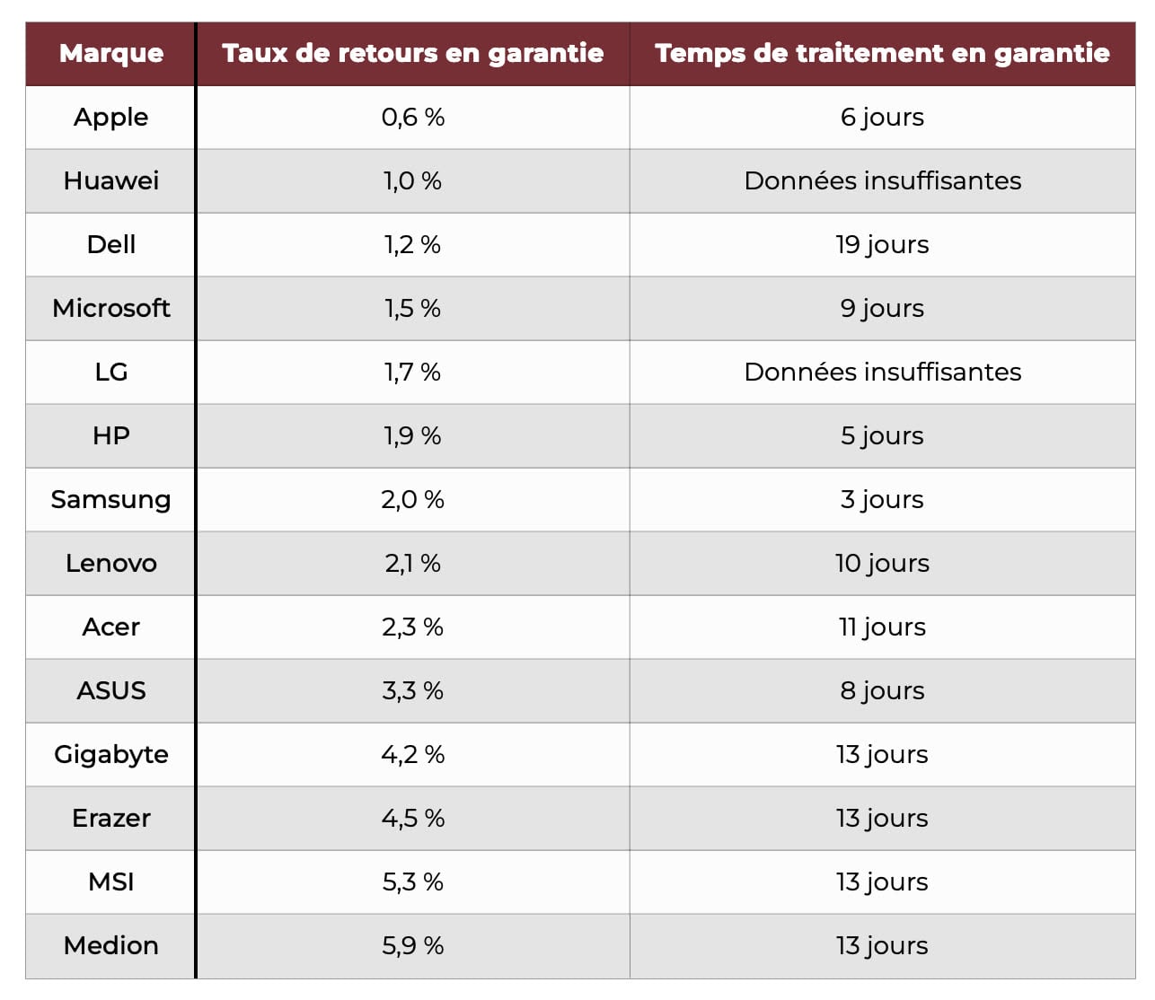 Pour les ordinateurs portables, la donne est la même : un taux de retours en garantie faible pour Apple (0,6 %, le meilleur) alors que les fabricants majeurs sont entre 1 et 2 % et que certains (Erazer, Medion, MSI) sont aux alentours de 5 % (5,9 % pour Medion). Le taux de rétractations est de 4 % pour Apple, ce qui est faible dans ce cas-ci, et dans la même fourchette que les autres. Medion ou MSI (encore) ont des valeurs plus élevées : 6,2 % et 11,6 %, ce qui montre qu'il y a probablement un problème de qualité.