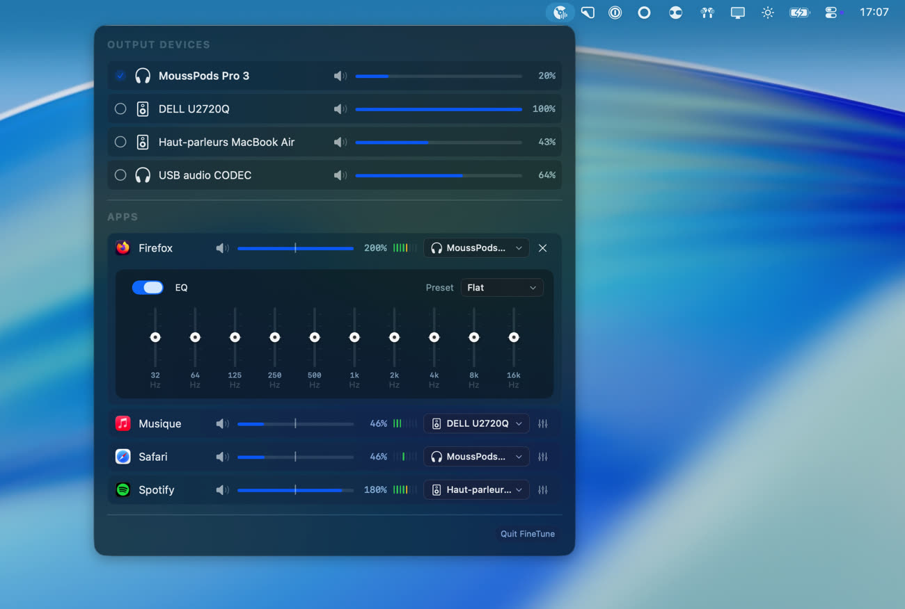 FineTune permet ainsi de gérer le son de manière indépendante pour chaque application et chaque sortie audio. Par exemple, on peut router le son du navigateur vers ses écouteurs, celui de Spotify vers les haut-parleurs de son Mac et celui d’une autre app vers son écran externe. Pour chaque app, on peut également ajuster le volume et personnaliser le rendu sonore à l’aide d’un égaliseur.