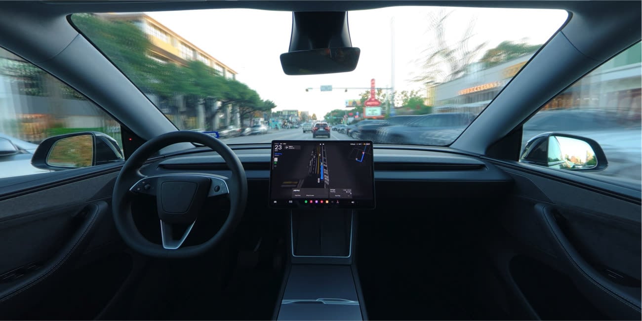 Une Model Y sans supervision à l’intérieur de l’habitacle dans le cadre du service de taxi autonome ouvert à Austin. Néanmoins, on ne le voit pas sur la photo, il y a une deuxième Model Y juste derrière avec des employés Tesla prêts à intervenir si nécessaire. Image Tesla.