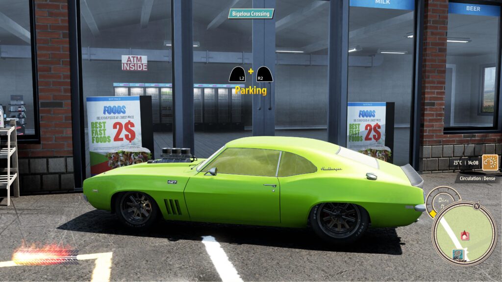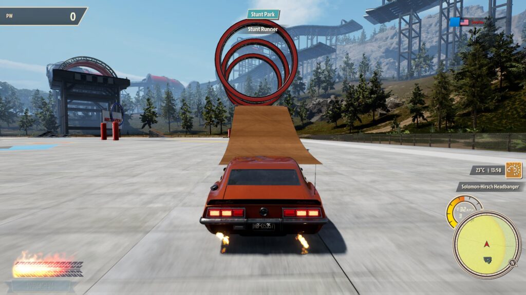 Notre premier contact avec le terrain de jeu de Wreckreation, lors de l’atterrissage sur le bitume, laissait espérer un vaste monde ouvert agréable à parcourir. Pourtant, l’expérience s’est révélée bien moins plaisante, en grande partie à cause d’une réalisation technique défaillante. Aliasing, clipping, ralentissements et textures peu engageantes sont les maîtres-mots d’une expérience visuelle peu glorieuse. Certes, le titre ne prétend pas rivaliser avec des références comme The Crew Motorfest ou Forza Horizon 5, mais un minimum de finition reste attendu – ce qui n’est pas le cas ici. De plus, le monde ouvert manque cruellement de vie. Malgré un trafic routier réglé sur Dense, la population est peu présente, les décors manquent de détails, et l’exploration s’avère rapidement plate et sans réel intérêt.