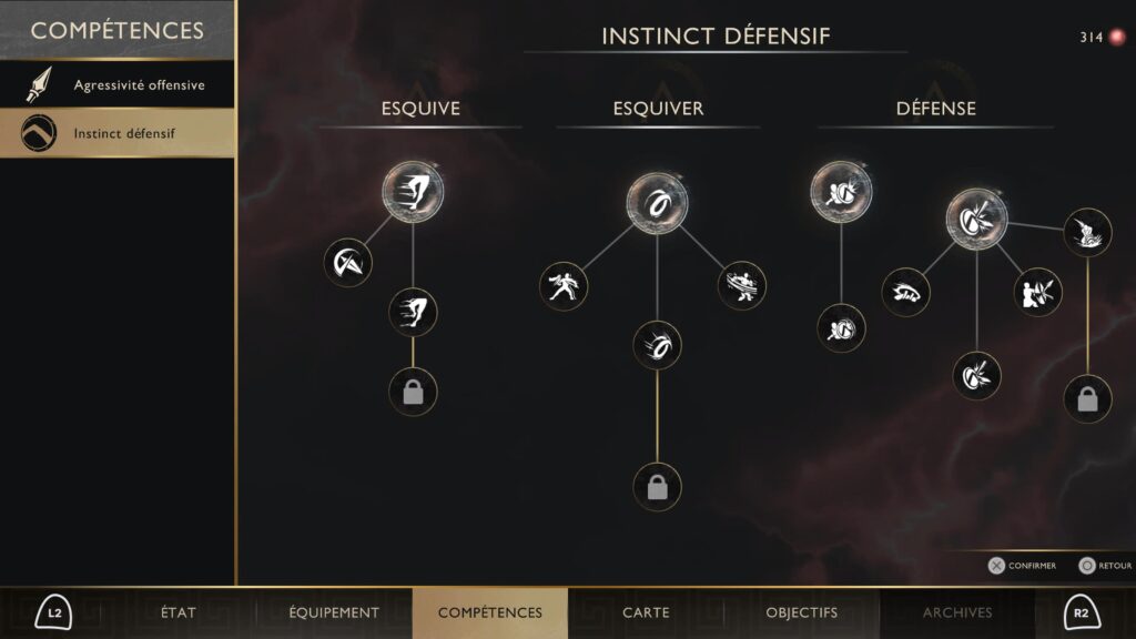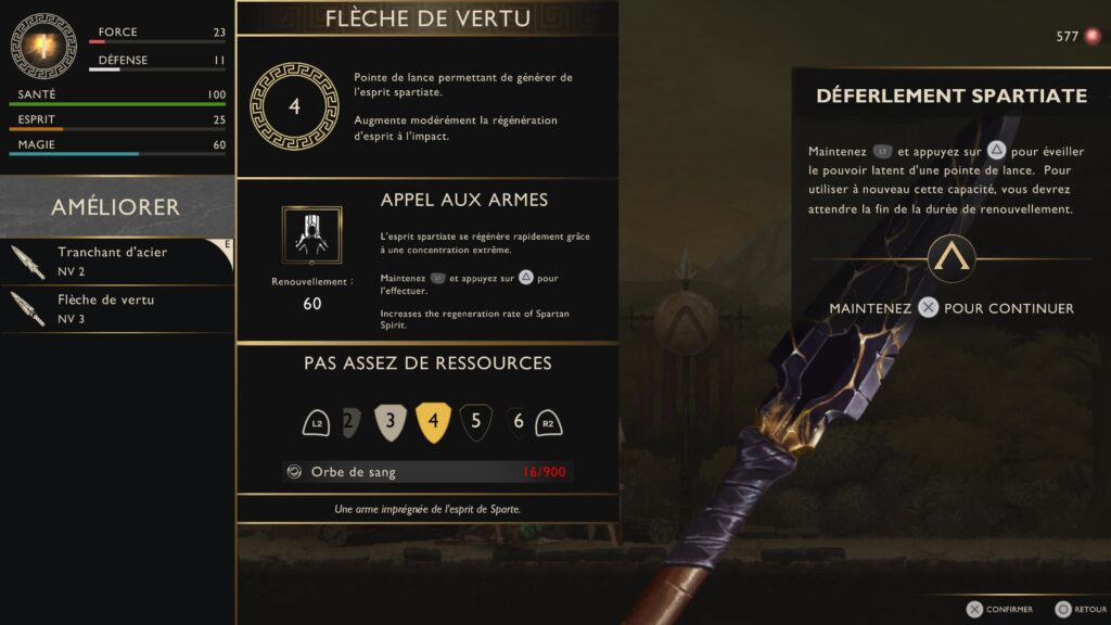 Parmi ces orbes, les orbes rouges jouent un rôle central : comme dans les épisodes principaux, elles servent à améliorer les capacités et l’arsenal de Kratos. L’arbre de compétences est plutôt léger, mais il permet tout de même d’orienter légèrement son style de jeu. Les armes peuvent également être améliorées, mais les ressources étant limitées, il faudra faire des choix. On en obtient en éliminant des ennemis ou en fouillant les coffres disséminés sur la carte.