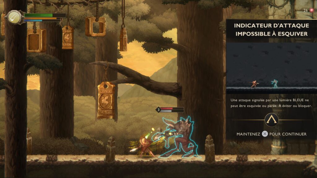 Côté difficulté, trois modes sont proposés dès le lancement : Garçon, Cadet et Spartiate. Il est impossible de passer des deux premiers au mode Spartiate en cours de route, mais bonne nouvelle pour les chasseurs de trophées : aucun trophée n’est lié à un niveau de difficulté. En difficulté Cadet, le challenge reste accessible. Le bestiaire est varié, mais ses patterns sont faciles à anticiper. Même constat pour les boss : ils disposent de plusieurs attaques, mais quelques essais suffisent généralement pour en venir à bout sans trop de dégâts.