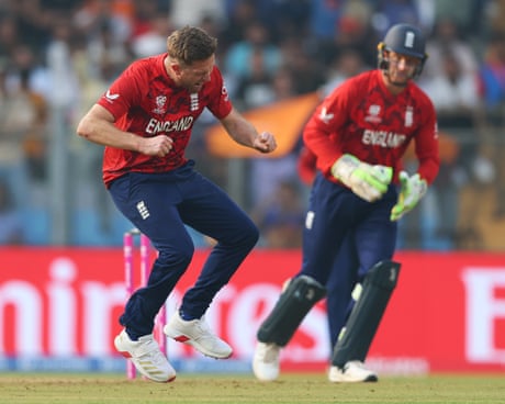 2nd over: England 19-1 (Buttler 4, Bethell 14) Jacob Bethell is the new batter. The 23 year old Malla is brought back to earth immediately as Bethell cashes in on some short stuff, a cut for four behind point is followed by a wallop over midwicket for SIX! Malla drops short again and is swivelled away for a third boundary in the over. A mixed bag from the debutant but he’ll remember that first ball for a long time.