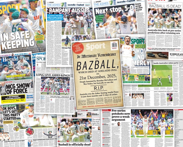 “Bazball is dead”, asserted the Sydney Morning Herald and The Age, quoting former Australian opener Simon Katich. The West Australian newspaper fully committed to the theme, mocking up a pronouncement of Bazball’s passing on ye olde parchment, “deeply lamented by Brendon McCullum and Ben Stokes, but basically no one else”.