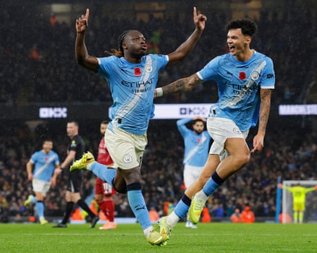 5 min Doku, who has made a lively start, nicks a loose ball on the edge of the area and forces his way between two Liverpool defenders. A third red shirt, Konate, steps across to clear.