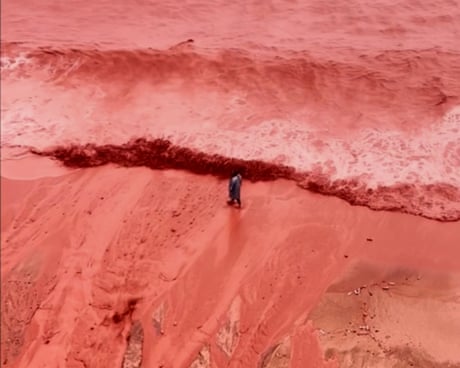 Rainfall on Iran’s Hormuz Island briefly transformed the coastline of its Red Beach into a striking natural scene this week, as red soil flowed into the sea and turned the water shades of deep red.