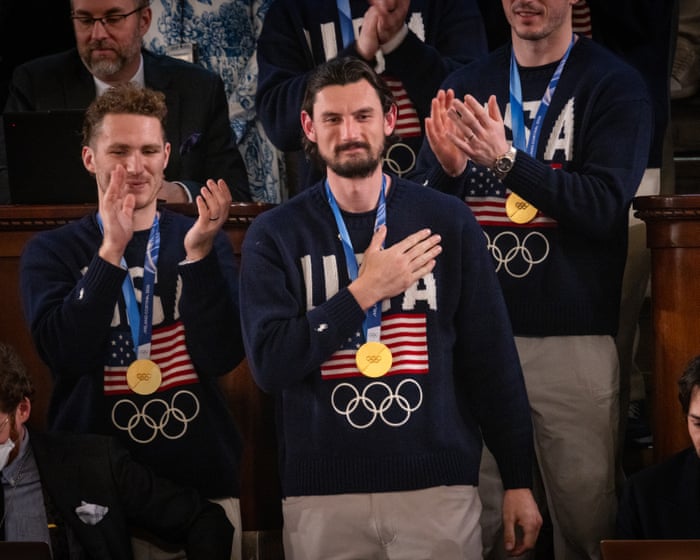 During Tuesday’s State of the Union, Donald Trump welcomed members of the US men’s national hockey team to the House gallery to chants of “U-S-A, U-S-A!”. Trump revealed that Team USA’s goaltender, Connor Hellebuyck will receive the Presidential Medal of Freedom. “What special champions you are,” Trump told the players, who had beaten Canada on Sunday in the final of the Winter Olympics.