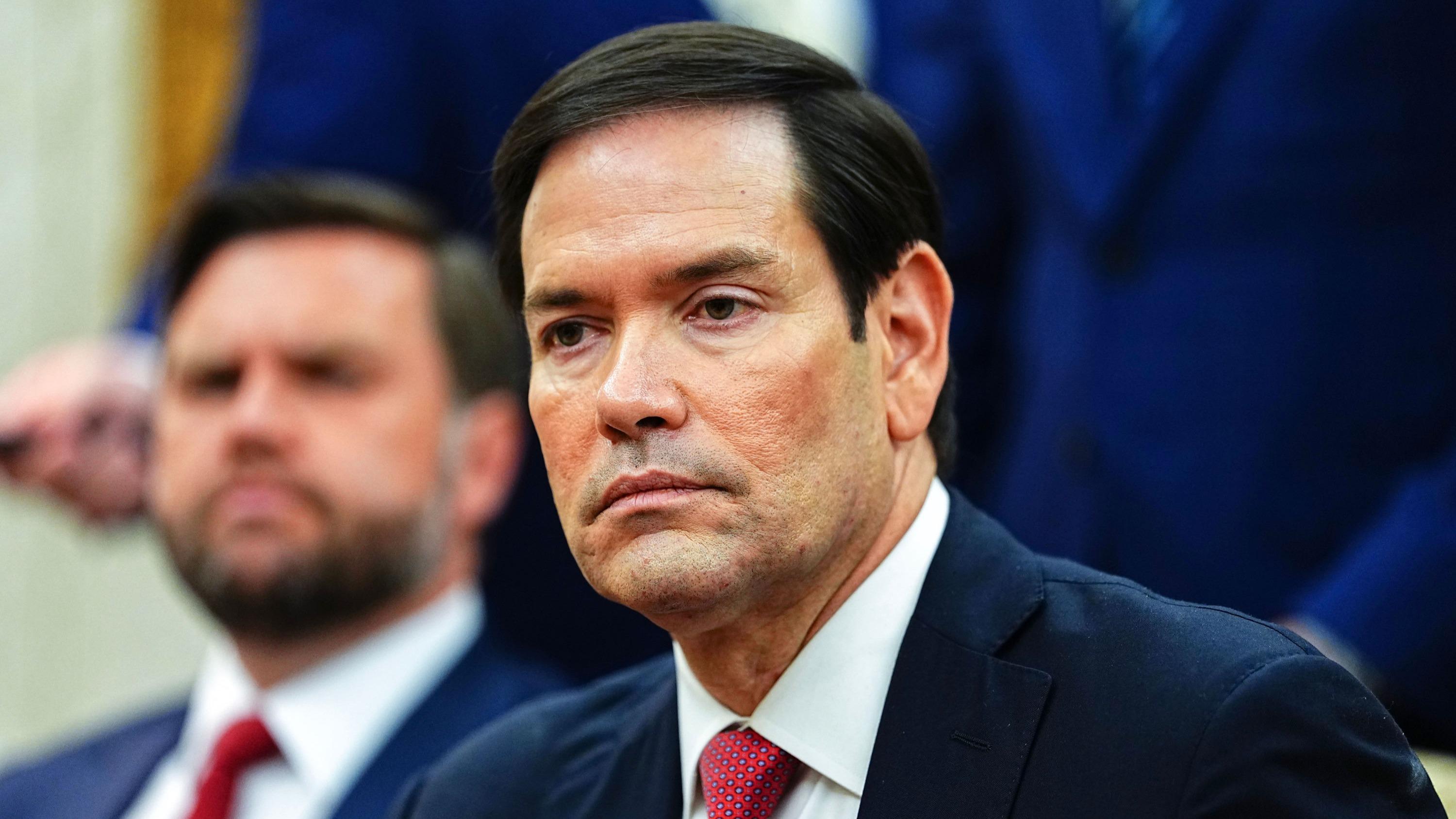 Le secrétaire d’État américain, Marco Rubio, et le vice-président américain, JD Vance (en arrière-plan), lors d’une réunion dans le Bureau ovale de la Maison-Blanche, à Washington, le 18 août 2025.