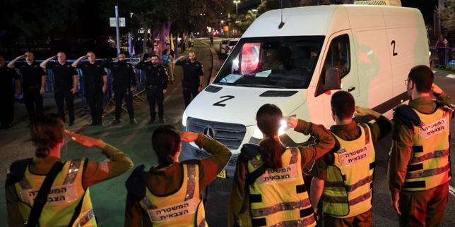Des policiers israéliens saluent l’arrivée du convoi transportant les dépouilles de quatre otages morts à Gaza, à l’institut national de médecine légale de Tel-Aviv, le 15 octobre 2025.