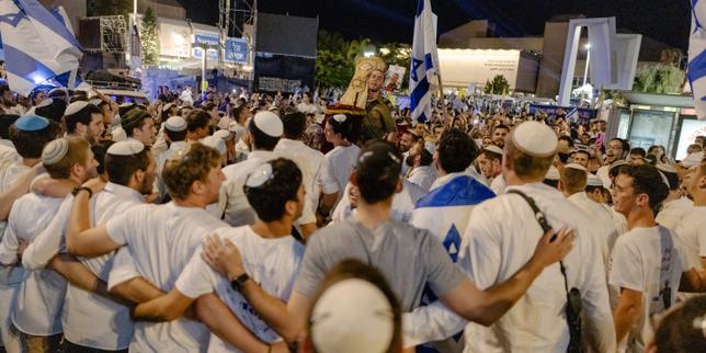 Près de la « place des otages », à Tel-Aviv, durant la fête religieuse de Simchat Torah, des hommes chantent et dansent autour d’une Torah, 14 octobre 2025.