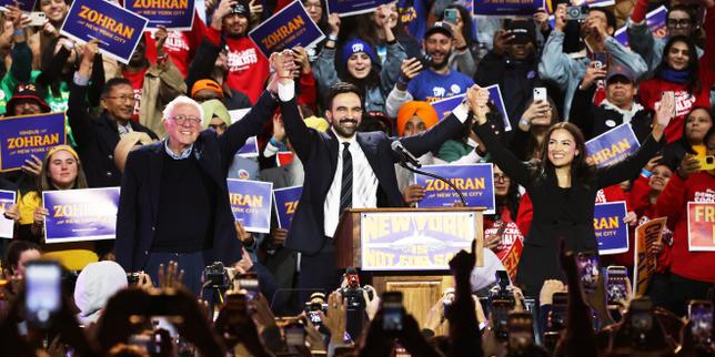 Le sénateur du Vermont, Bernie Sanders, le candidat démocrate à la Mairie de New York, Zohran Mamdani, et la représentante Alexandria Ocasio-Cortez, lors d’un rassemblement de campagne au Forest Hills Stadium, à New York, le 26 octobre 2025.