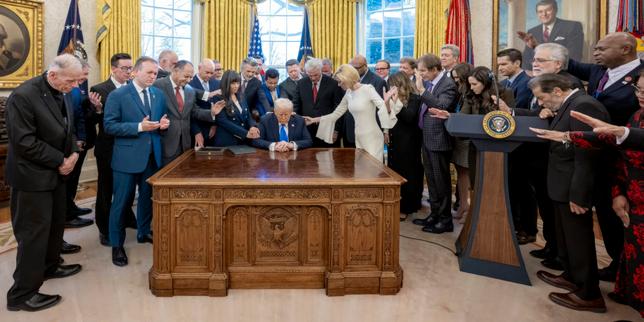 Donald Trump, entouré de chrétiens évangéliques, prie avant de signer le décret créant le White House Faith Office, dans le bureau Ovale de la Maison Blanche, à Washington, le 7 février 2025.