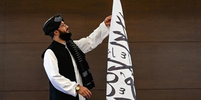 Un Afghan ajuste le drapeau taliban avant une conférence de presse du ministre afghan des affaires étrangères, Amir Khan Muttaqi, à l’ambassade d’Afghanistan à New Delhi, le 12 octobre 2025.