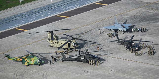 De gauche à droite : un hélicoptère Puma des forces aériennes roumaines, un Chinook de l’armée américaine, un Apache de l’armée américaine, un hélicoptère médicalisé de l’armée américaine et un avion de chasse Typhoon appartenant aux forces aériennes allemandes, à la base aérienne de Mihail-Kogalniceanu, en Roumanie, le 25 novembre 2025.