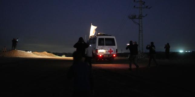 Un convoi de la Croix-Rouge transportant la dépouille d’un otage israélien présumé se dirigeant vers le point de passage frontalier avec Israël, à Deir Al-Balah, dans le centre de la bande de Gaza, le 25 novembre 2025.