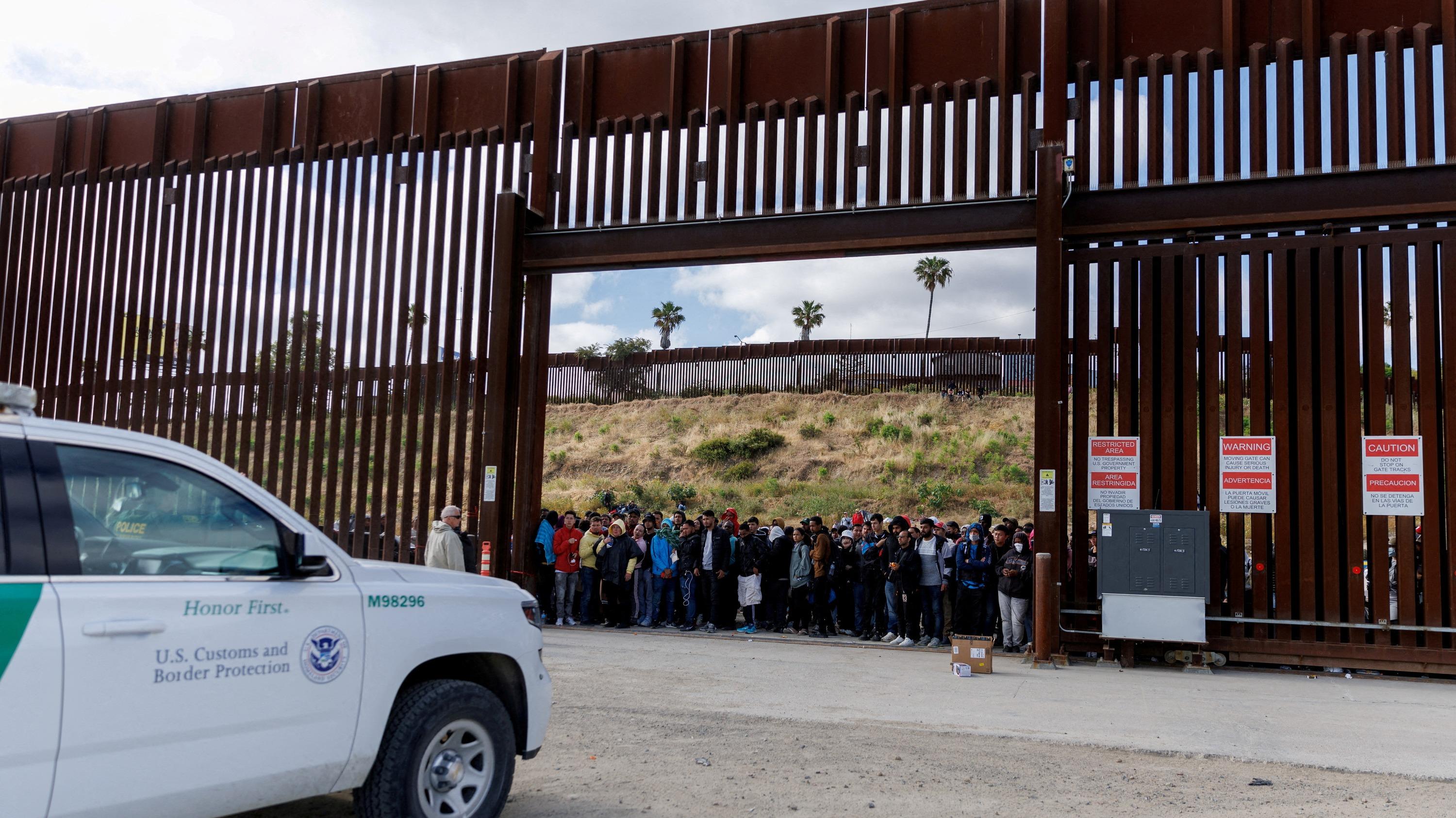 Un agent de la police aux frontières américaine surveille des migrants à la frontière mexicaine, à San Diego, le 8 mai 2023.