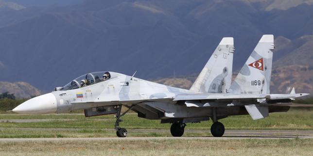 Un avion de combat atterit durant une démonstration aérienne, à Maracay, au Venezuela, le 29 novembre 2025. AP Photo : Cristian Hernandez
